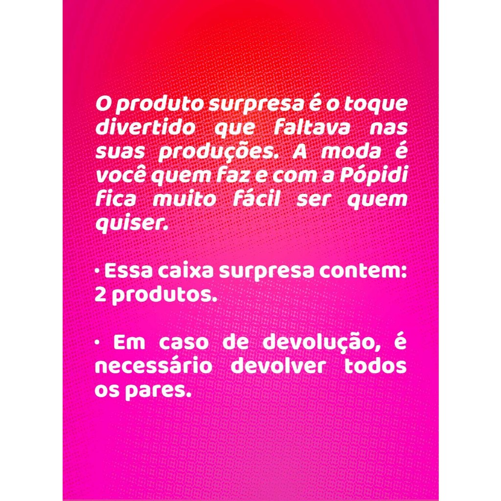 A felicidade vem dentro das caixas do nosso produto sortido! Com calçados selecionados a dedo para o conforto das crianças, é possível fazer combinações perfeitas para qualquer ocasião, desde as mais casuais (com roupas de tecidos leves e cores neutras), até algumas opções mais fashionistas (com peças de cores mais vibrantes e tecidos diversos). Pensado especialmente para os pequenos estilosos de plantão, o produto surpresa é o toque divertido que faltava nas suas produções. A moda é você quem faz e com a Pópidi fica muito fácil ser quem quiser. · Essa caixa sortida contem: 2 Calçados Bebê (menina) Tabela de Medidas: Não temos essa informação referente ao produto surpresa, pois depende da disponibilidade dos modelos de calçados de bebê destinados a essa promoção, considerar o tamanho como Padrão. · Em caso de devolução, é necessário devolver todos os pares Sobre a Marca: Conectados com o universo infantil através de produtos que transmitem nossos valores, a Pópidi acompanha o dia a dia da criança com muito respeito, dedicação e atitude, desde o nascimento até a pré-adolescência. Oferecemos proteção, conforto e estilo, buscando sempre inovar a cada lançamento. Cuidando com excelência da relação pré e pós vendas, afinal a satisfação de nossos clientes é muito importante para nós. Atendimento: Segunda à sexta: 07:00 às 18:00 Sábado: 08:00 às 12:00 Boas compras e volte sempre!!!