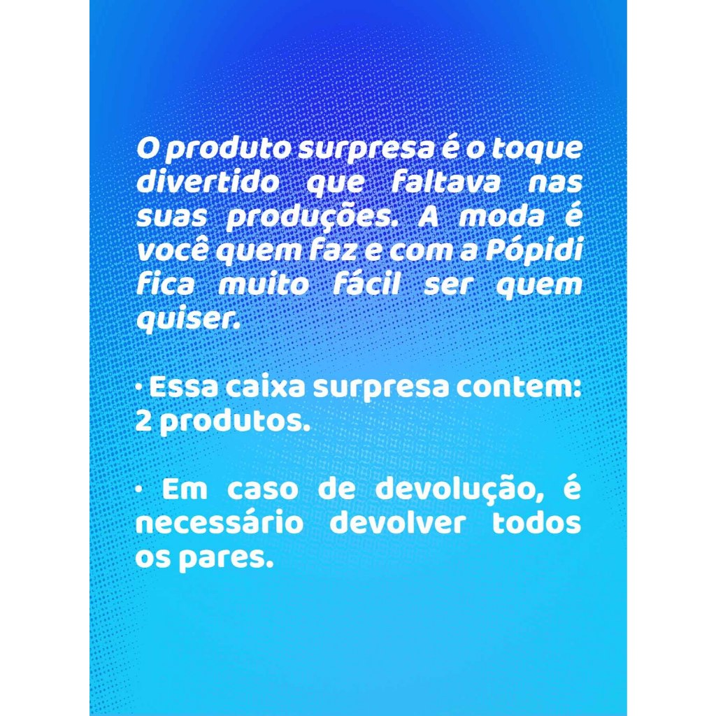 A felicidade vem dentro das caixas do nosso produto sortido! Com calçados selecionados a dedo para o conforto das crianças, é possível fazer combinações perfeitas para qualquer ocasião, desde as mais casuais (com roupas de tecidos leves e cores neutras), até algumas opções mais fashionistas (com peças de cores mais vibrantes e tecidos diversos). Pensado especialmente para os pequenos estilosos de plantão, o produto surpresa é o toque divertido que faltava nas suas produções. A moda é você quem faz e com a Pópidi fica muito fácil ser quem quiser. · Essa caixa sortida contem: 2 Chinelos (menino) Tabela de Medidas: Não temos essa informação referente ao produto surpresa, pois depende da disponibilidade dos modelos de Chinelos destinados a essa promoção, considerar o tamanho como Padrão. · Em caso de devolução, é necessário devolver todos os pares Sobre a Marca: Conectados com o universo infantil através de produtos que transmitem nossos valores, a Pópidi acompanha o dia a dia da criança com muito respeito, dedicação e atitude, desde o nascimento até a pré-adolescência. Oferecemos proteção, conforto e estilo, buscando sempre inovar a cada lançamento. Cuidando com excelência da relação pré e pós vendas, afinal a satisfação de nossos clientes é muito importante para nós. Atendimento: Segunda à sexta: 07:00 às 18:00 Sábado: 08:00 às 12:00 Boas compras e volte sempre!!!