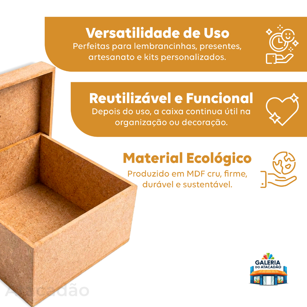 Produzidas em MDF cru de alta qualidade, essas caixas unem resistência, encaixe perfeito e um visual clean, prontas para personalização. 🔹 Cada caixa possui tampa solta modelo sapato, garantindo fechamento fácil e seguro. 🔹 O acabamento liso proporciona excelente aderência para tintas, tecidos, papéis, adesivos e aplicações decorativas. 📐 Informações técnicas Material: MDF cru de alta qualidade Modelo: Tampa sapato (encaixe fácil) Tamanhos externos: 12 × 12 × 5 cm Envio: Bem embalado e no mesmo dia da compra. ✅ Benefícios do produto: - Prontas para pintar, forrar ou decorar - Estrutura resistente e durável - Visual neutro que valoriza qualquer personalização - Ideal para produção artesanal e revenda 🏡 Onde usar: - Lembrancinhas de festas e eventos - Presentes personalizados - Artesanato em geral - Decoração criativa - Kits para datas comemorativas - Encomendas e revenda artesanal 💡 Por que escolher este kit? Porque ele oferece qualidade, praticidade e liberdade criativa em um só produto. Um item indispensável para artesãos, lojistas e quem deseja encantar clientes ou convidados com peças personalizadas e bem-acabadas. 🎨 Personalize do seu jeito e transforme simples caixas em verdadeiras experiências!