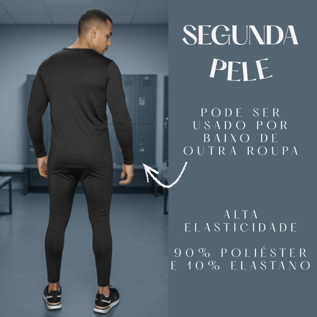 Kit Camisa e Calça Térmica Prepare-se para enfrentar qualquer clima com o nosso exclusivo Kit Camisa e Calça Térmica. Desenvolvido para proporcionar conforto, estilo e proteção, este conjunto é perfeito para diversas atividades ao ar livre. Camisa Térmica Segunda Pele UV 50+ PROTECTION Proteja sua pele dos raios UV-A e UV-B com a nossa Camisa Térmica, equipada com FPU 50+ para um bloqueio eficaz de 99% desses raios prejudiciais. A composição de 90% Poliéster e 10% Elastano garante conforto e durabilidade. Ideal para piscina, praia, trilha, pescaria, caminhada, corrida, e muito mais. Composição: 90% Poliéster 10% Elastano Proteção UV: Permanente, bloqueia 99% dos raios UV-A e UV-B Uso: Piscina, Praia, Trilha, Pescaria, Caminhada, Corrida, Atividades ao Ar Livre, entre outras. Tipo: Manga longa Gola: Redonda Origem: Nacional - Fabricação Própria Garantia: Defeito de fabricação Cuidados: Dispensa o uso de amaciante, Dispensa o uso de ferro de passar Calça Térmica Complemente seu visual com a nossa Calça Térmica, projetada para proporcionar isolamento eficaz e ajuste elegante. Feita com tecido Poliéster e Elastano, esta calça é versátil e ideal para enfrentar temperaturas variadas. Seu design funcional e atemporal a torna indispensável para qualquer guarda-roupa de inverno. Tecido: Poliéster com Elastano Elástico na cintura: Sim Ideal para: Calor e frio Proteção UV: 50+ Confortável e Elástico: Sim Mobilidade: Proporciona mais mobilidade Manter temperatura corporal: Sim Previne assaduras de atrito: Sim Protege do Vento: Sim Secagem rápida: Sim