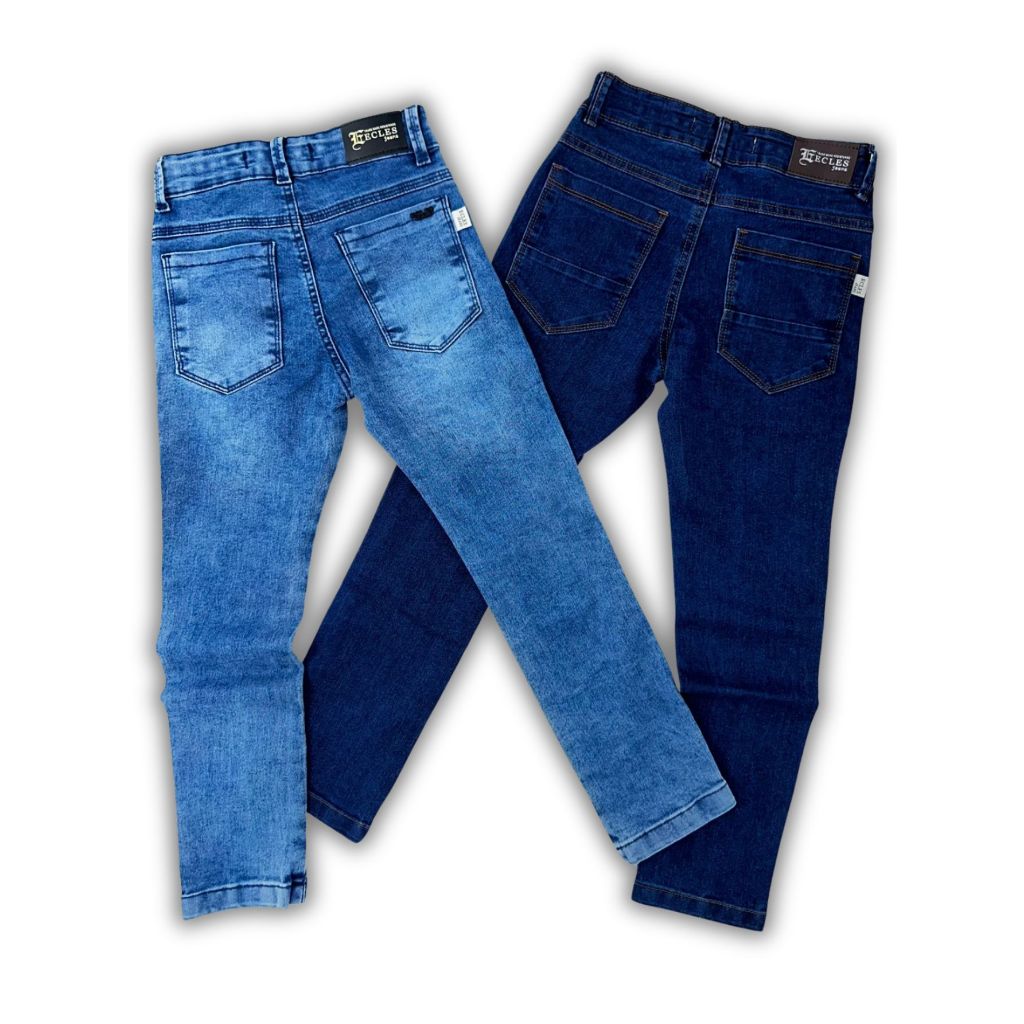 Marca ECLES JEANS Calça infantil e juvenil No Kit contém duas calças no mesmo tamanho Tecido Jeans 1° kit Cor lavagem escura e média 2° kit Cor lavagem escura e clara Tecido com elastano Com regulagem no cós Confortável Alta Costura Tamanho real
