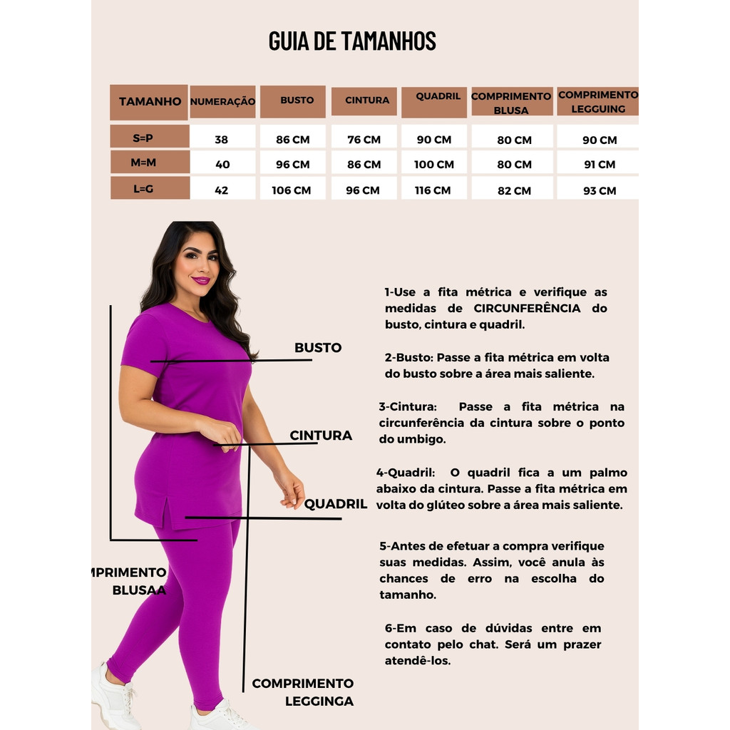 PRONTA ENTREGA E ENVIO IMEDIATO!!!!Preparamos algo verdadeiramente especial para você - Transforme seu look com o nosso Conjunto Feminino Moda Evangélica Fitness Com Calça Legguing e Blusa Long Line Com Mangas projetado especialmente para mulheres cristãs que buscam um ajuste elegante, sofisticado e confortável em um único design. Essa roupa para academia moda evangélica é a escolha ideal para mulheres que querem praticidade e conforto durante os treinos, passeios, esporte ao ar livre, musculação. Desenhado especialmente para atender às necessidades da moda gospel e evangélica que nossas roupas fitness evangélicas possuem um comprimento adequado unindo a beleza, a elegância e a sua versatilidade e vestibilidade . Compre agora e não perca essa oportunidade única, pois nosso estoque de cores é limitado. - Conjunto Short Saia + Blusa T-shirt com Mangas - Tecido Poliester Resistente - Zero Transparência - Tem ótima qualidade. - Tecido Com Elastano- Ajustável ao Corpo - Sem bojo - Postagem Imediata. Exceto aos finais de semana e feriados - Com uma fita métrica tire as medidas da cintura, busto e quadril e compare com as medidas disponíveis abaixo. Assim, você terá mais segurança ao efetuar a compra. - Estaremos disponíveis no chat para mais informações. Será um prazer atendê-los. TABELA DE MEDIDAS P(38) BUSTO: 86cm CINTURA ALTA: 76cm COMPRIMENTO BLUSA: 80 cm QUADRIL: 90 cm COMPRIMENTO CALÇA LEGGUING: 90cm M(40) BUSTO: 96cm CINTURA ALTA: 86cm COMPRIMENTO BLUSA: 80cm QUADRIL: 100cm COMPRIMENTO CALÇA LEGGUING: 90cm G(42) BUSTO: 106cm CINTURA ALTA: 96cm COMPRIMENTO BLUSA: 82cm QUADRIL: 116cm COMPRIMENTO CALÇA LEGGUING: 93cm