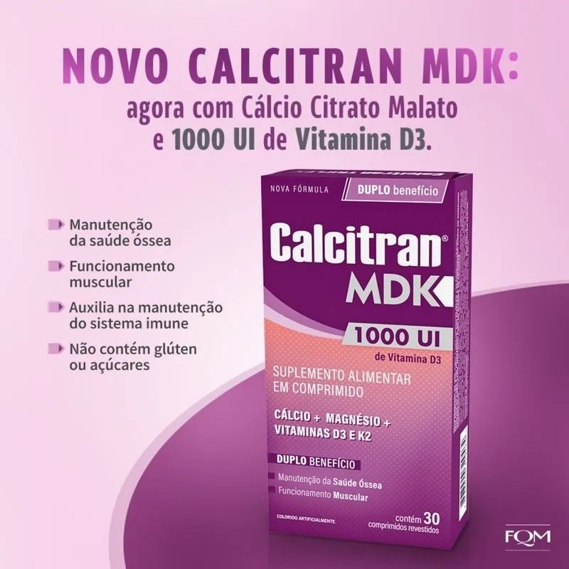 Kit Calcitran MDK 90 comprimidos (30+60)O cálcio é o mineral mais abundante do corpo humano e é considerado um dos mais importantes. A principal função do cálcio é contribuir para o desenvolvimento saudável dos dentes e dos ossos. A vitamina D3 auxilia na absoção do calcio e a K2 na fixação do mesmo. O magnesio atua na função muscular. Informação Nutricional: (1 Comprimido) Calcio 250mg Vitamina D 1000ui Magnesio 126mg Vitamina K 18ug NÃO CONTEM GLÚTEN