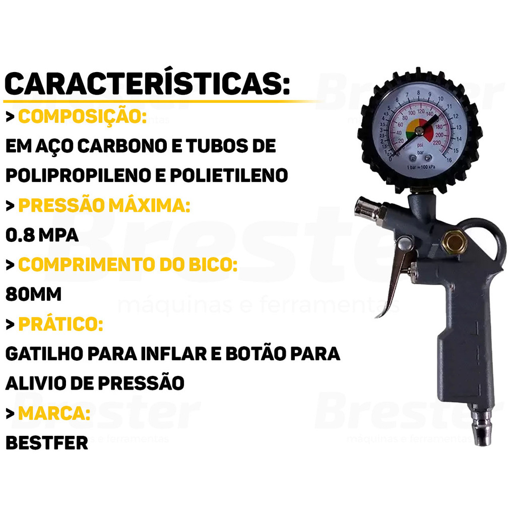 Olá, Bem vindo a Distribuidora Brester. Trabalhamos com uma grande variedade de ferramentas elétricas e manuais, descartáveis, eletroeletrônicos, artigos para casa, artigos de petshop e outros. Aqui você encontrará Produtos Originais, Nota Fiscal, Pronta Entrega e Envio Imediato! Informações do Produto: Kit Calibrador Manual De Pneus Com Manômetro Analógico Bestfer O Kit Calibrador Manual é a solução para a calibragem rápida e eficiente que você tanto deseja! Calibre seus pneus com confiança, evitando desgaste irregular e aumentando a vida útil dos pneus. Este kit é intuitivo e portátil, tornando a calibragem uma tarefa rápida e descomplicada. Características: > Tubos de plástico; > Produzido em aço carbono; > Comprimento do Bico: 80 mm; > Pressão Máxima: 0.8 Mpa; > Pressão Normal: 0.2 - 0.4 Mpa. - Marca: Bestfer - Garantia: 90 dias contra defeitos de fabricação Vantagens de comprar na Brester: - Nota fiscal para Pessoa Física e Pessoa Jurídica; - Produto novo, com garantia de fábrica; - Produto a pronta entrega; - Envio em até 24hs em dias úteis após confirmação do pagamento. Obrigado por escolher a Brester Máquinas.
