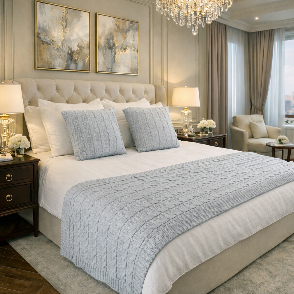 Kit Cama Manta Peseira de Tricot + 2 Capas de Almofada Para Cama e Sofá – Casal, Queen e King