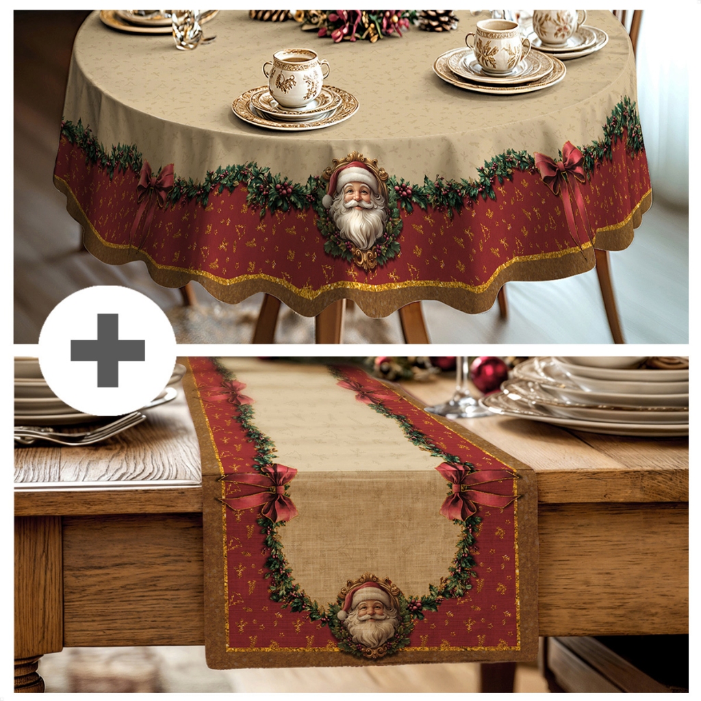 Kit Caminho de Mesa Natal 140x040m + Toalha de Mesa 4 Lugares Redonda 140x140m - Mesa Posta Natalina