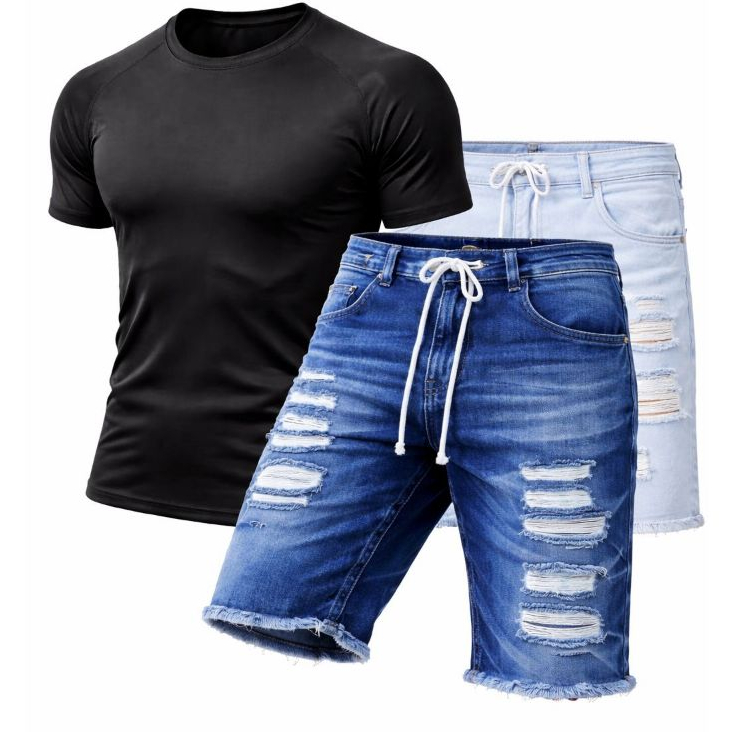 Kit Camisa Dry Fit Uv + Bermuda Jeans Masculina C/ Lycra Casual Confortável Estilo