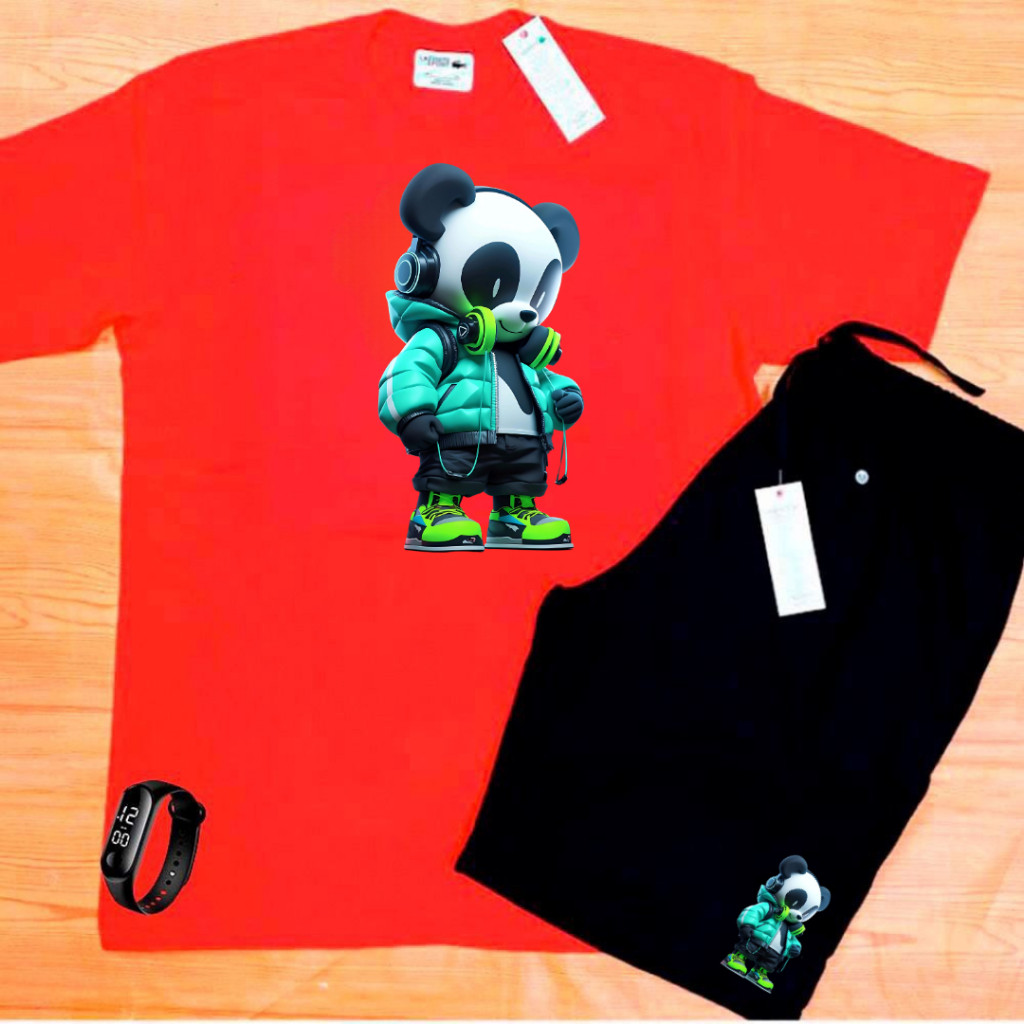 kit camiseta algodão 30.1 bermuda e relogio estampa PANDA FOFO verão praia caminhada