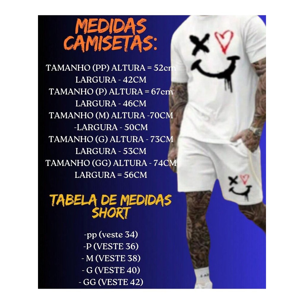 KIT CAMISETA + SHORT LANÇAMENTO!!! Olá Seja Bem Vindos a Nossa Loja é Uma Prazer Receber Sua Visita! Descrição do Produto Camiseta - Malha: 100% Algodão, - Fio 30.1 - 180gr. - Excelente Acabamento Costura Dupla Reforçada, Gola Redonda Reforçada, Caimento Perfeito. Qualidade Aprovada por Milhares de Clientes! - Fabricação Própria - Envio Imediato Adulto e Infantil Medidas de Referência CAMISETA: TAMANHO PP ALTURA = 52cm LARGURA = 42CM TAMANHO P ALTURA = 67cm LARGURA = 46CM TAMANHO M ALTURA = 70CM LARGURA = 50CM TAMANHO G ALTURA = 73CM LARGURA = 53CM TAMANHO GG ALTURA = 74CM LARGURA = 56CM Descrição do Produto - Malha Premium: 100% Algodão, - Excelente Acabamento Costura Dupla Reforçada, Caimento Perfeito. Qualidade Aprovada por Milhares de Clientes! - Fabricação Própria - Envio Imediato TABELA DE MEDIDAS SHORT ADULTO: - PP (VESTE 34) - P (VESTE 36) - M (VESTE 38) - G (VESTE 40) - GG (VESTE 42)