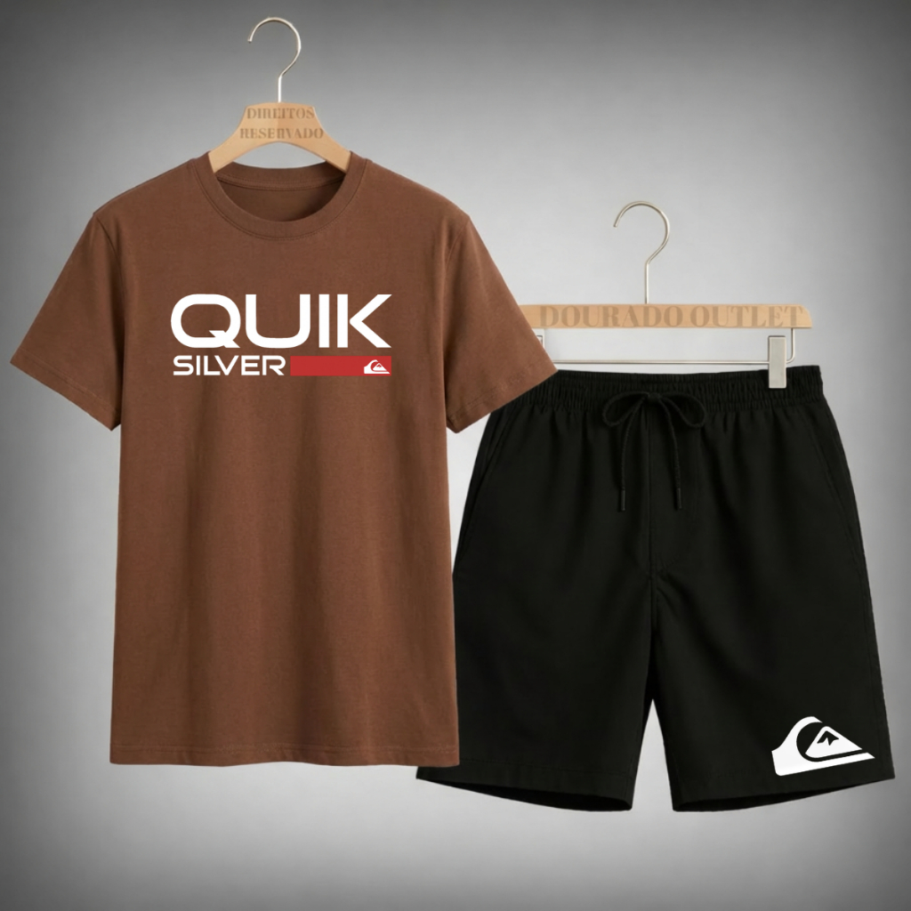 Kit Camiseta Masculina e Short Estampada Quiksilver Tagline Streewear Sk8 Surf Adventure Algodão Conforto