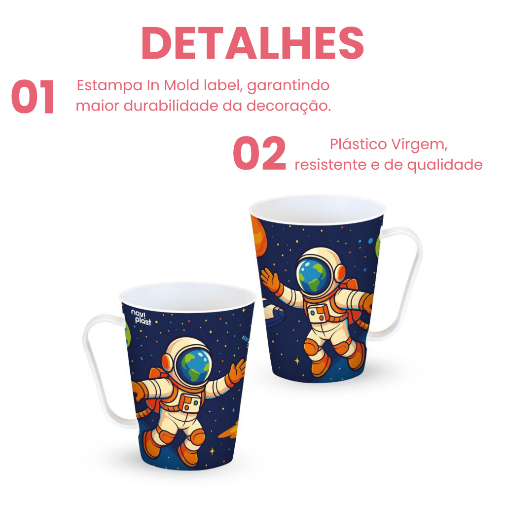 Destaques do Produto: .Design Astronauta e Encantador Estampas vibrantes .Capacidade Ideal Com 430ml, ideal para suas bebidas preferidas, como café, chá, chocolate quente, sucos ou refrigerantes. .Material de Alta Qualidade Produzida em plástico virgem 100% livre de BPA, garantindo segurança, resistência e durabilidade para o uso diário. .Totalmente seguro para a saúde! .Pode Ir ao Micro-ondas Pode ser utilizada no micro-ondas sem problemas, tornando-a prática para o dia a dia. .Decoração In Mold Label Tecnologia avançada de decoração, que garante uma estampa durável, com cores vivas que não desbotam nem descascam com o tempo. .Fácil de Limpar e Manusear Leve, resistente e fácil de limpar, ideal para o uso no dia a dia. Pode ser lavada na máquina de lavar louças sem perder a qualidade. -Especificações: .Capacidade: 430ml por unidade .Material: Plástico virgem 100% livre de BPA .Decoração: Estampa Astronauta (conforme imagem do anúncio) .Tecnologia de Decoração: In Mold Label Estampa de alta durabilidade .Pode Ir ao Micro-ondas: Sim .Fácil de Limpar: Sim