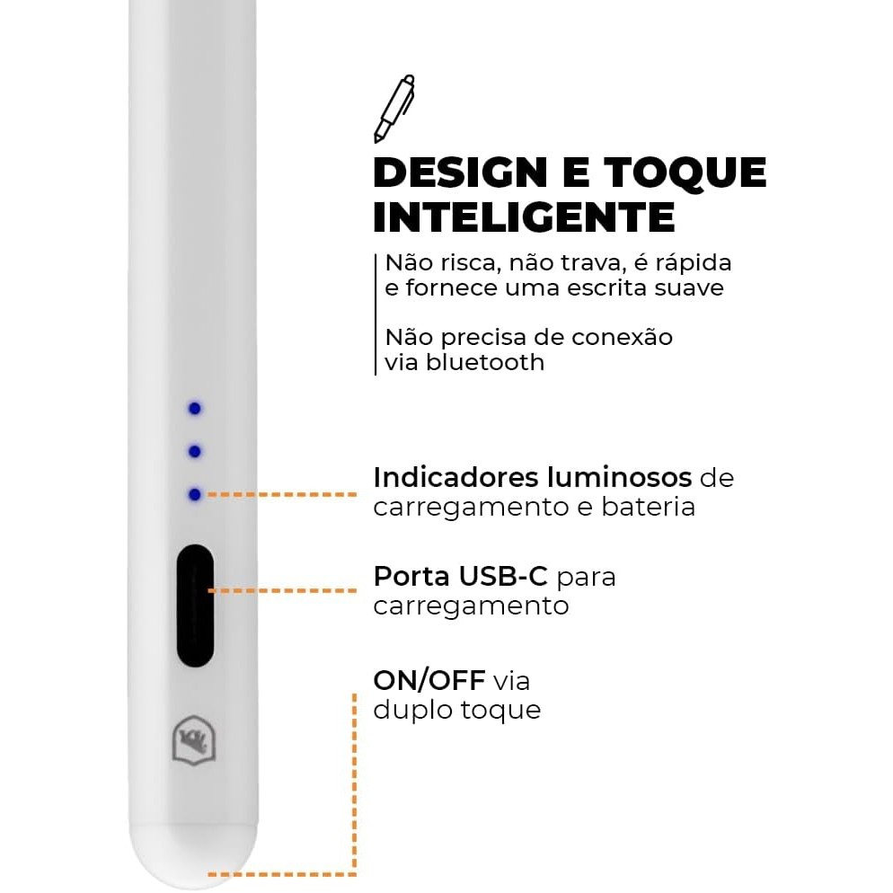 À procura de uma caneta de alta precisão para seu iPad? Sua busca termina aqui! A Caneta Touch Capacitiva Pro da Gshield é a escolha ideal para aprimorar sua experiência de escrita e desenho digital. O que é Palm Rejection? O Palm Rejection, ou rejeição da palma, é principal característica desta caneta. Ela permite que você escreva e desenhe com total liberdade, sem se preocupar com toques acidentais da palma da mão na tela. A caneta reconhece apenas o toque intencional da ponta, tornando sua experiência de uso livre de interrupções indesejadas. Isso não apenas elimina a frustração de toques acidentais, mas também proporciona uma experiência suave e natural na escrita e no desenho. Sua tela permanece limpa, sem riscos indesejados, e você pode trabalhar com confiança! Desbloqueie seu potencial criativo Muito mais do que uma simples caneta! Tenha uma ferramenta versátil e poderosa que pode ser usada em uma variedade de situações para melhorar sua produtividade e criatividade, esta caneta é a escolha perfeita para estudantes que desejam fazer anotações detalhadas, artistas que buscam expressar sua arte com detalhes incríveis e profissionais de arquitetura, design e até tatuadores que precisam de precisão em seus projetos ou trabalhos. Crie obras-primas digitais com facilidade! Função Tilt Bold: Equipada com função Tilt Bold, a sensibilidade da caneta se adapta de acordo com a pressão de inclinação, isso significa que você pode criar traços finos ou grossos, dependendo do ângulo de inclinação da caneta. Isso torna suas obras de arte ainda mais realistas e detalhadas. Com sua ponta de silicone POM de alta qualidade, cada traço é suave e preciso, proporcionando resultados incríveis. Além da alta precisão do silicone POM, esse tipo de ponta ainda conta com propriedades de alta rigidez, alta resiliência e baixo desgaste garantindo sua durabilidade mesmo em uso contínuo. Indicador de Bateria e Carregamento rápido: A caneta também possui um indicador de bateria de três segmentos, permitindo que você acompanhe facilmente o nível de carga restante. E, graças ao seu rápido tempo de carga de apenas 10-15 minutos, você estará pronto para criar em pouco tempo. Leveza e Durabilidade Com um peso de apenas 13 gramas, a Caneta Touch Capacitiva Pro oferece uma experiência de escrita natural e eficiente, garantindo uma aderência confortável em cada traço. Seu corpo é meticulosamente construído a partir de uma liga de alumínio super durável que garante excepcional resistência. Além disso, sua elegante cor branca é acentuada por uma textura fosca envernizada de alta qualidade, elevando-a ao status de um produto minimalista e elegante. Seu corpo metálico incorpora um ímã adicional, a caneta pode ser anexada magneticamente à lateral do iPad e possui o tamanho ideal para capas com suporte a Apple Pencil. A função de sucção integrada, uma característica única das canetas capacitivas, permite que você afixe a caneta a superfícies metálicas, mantendo-a sempre à mão quando necessário. Essa combinação de design sólido, construção premium e funcionalidade inteligente torna a Caneta Touch Capacitiva Pro um instrumento de escrita que atende às mais altas expectativas. Uso Simples e intuitivo Para ligar ou desligar a Caneta Touch Capacitiva Pro, toque duas vezes no botão localizado na parte superior da caneta. Observe o indicador de status da bateria para saber quando a caneta está carregando. Quando a luz vermelha estiver acesa, a caneta está em processo de carregamento. A luz ficará verde quando a carga estiver completa. Lembre-se de que o botão desligar não possui um indicador de cor, enquanto o botão ligar emitirá uma luz azul. Não perca mais tempo! Adquira agora a Caneta Touch Capacitiva Pro da Gshield e leve sua criatividade a um novo nível. Diga adeus aos toques acidentais e comece a criar com precisão e liberdade. Experimente uma experiência de escrita e desenho incrivelmente intuitiva! ESPECIFICAÇÕES - Marca: Gshield - Cor: Branca - Tipo de ponta: Silicone POM com alta precisão - Porta de carregamento: Tipo-C - Capacidade da bateria: 100mAh - Tempo de recarga: entre 10 e 15 minutos - Imput: 5V/0.7A - Tipo de Bateria: Polímero de Lítio - Duração de Bateria: Entre 8 e 10 horas - Tempo em espera/ stand-by : Com carga total até 180 dias - Material: Liga de Alumínio - Largura do traço: Largura adaptável de acordo com a pressão e inclinação da caneta - Desligamento automático: ocorre em 5 minutos quando não usada - Tamanho: 16,7 x 0,96 cm - Peso: 13 gramas COMPATIBILIDADE - iPads lançados a partir de 2018. Modelos:, iPad 6 (2018), iPad Mini 5 (2019), iPad Air 3 (2019), iPad Pro (2018 e 2020), iPad Pro 3 (2018), iPad 7(2019), iPad Pro 4 (2020). *Dispositivos lançados antes de 2018 não possuem suporte à tecnologia Palm Rejection (não têm a função de evitar toque acidental) e modelos de uso geral podem ser usados.* *NÃO FUNCIONA NA LINHA GALAXY TAB*