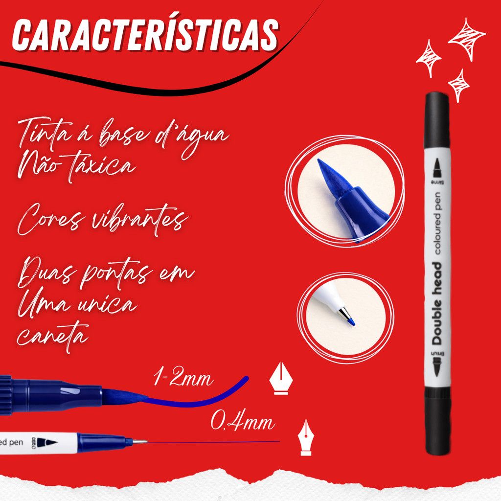 O kit 48 de canetas marcador ponta dupla é ideal para quem busca versatilidade, precisão e cores vibrantes em um único produto. Cada caneta possui duas pontas em uma só estrutura, permitindo criar desde detalhes finos até preenchimentos suaves com excelente controle. A ponta fina de 0,4 mm é perfeita para traços precisos, escrita, detalhes e marcações delicadas. Já a ponta brush de 1 a 2 mm é ideal para pintura, lettering, preenchimentos e efeitos aquarelados. A tinta à base de água é não tóxica, seca rápido e garante cores intensas sem danificar o papel. Indicada para desenho, pintura, estudos, bullet journal, lettering, ilustração e uso escolar ou artístico. Características Caneta ponta dupla Ponta fina 0,4 mm Ponta brush 1–2 mm Tinta à base de água Não tóxica Cores vibrantes Duas pontas em uma única caneta Medidas Comprimento aproximado: 16 cm Um conjunto completo para soltar a criatividade com precisão e acabamento profissional. Garantia do vendedor: 7 dias