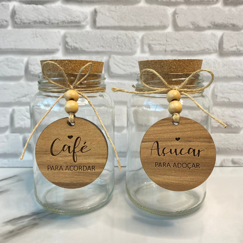 Kit Cantinho do Café + Açúcar | 2 potes de Vidro 600 ml + Tampa rolha cortiça + Tag| Pote Mantimento|