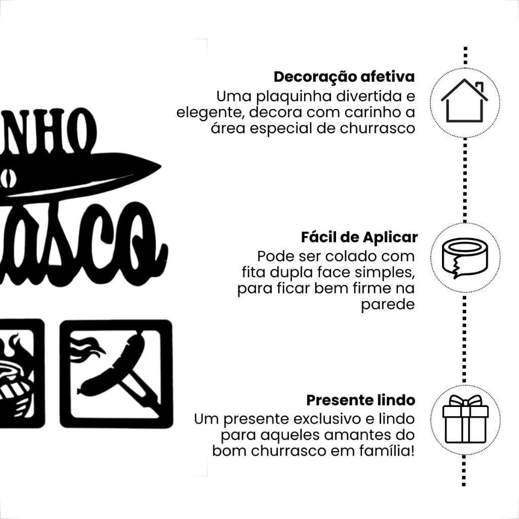 Kit Cantinho do Churrasco em MDF Preto – Decoração Perfeita para Área Gourmet ou Churrasqueira Transforme sua área de lazer com o nosso Kit Cantinho do Churrasco, feito em MDF preto premium e recortado a laser. Um conjunto moderno e divertido, ideal para compor a decoração da área gourmet, churrasqueira, cozinha ou até mesmo aquele espaço especial de confraternização. Esse kit é composto por uma placa decorativa Cantinho do Churrasco no tamanho 13x30 cm e mini plaquinhas de 10x10 cm, formando uma composição harmoniosa. O material de MDF 3mm preto fosco proporciona um toque elegante, tornando-o perfeito para quem busca uma plaquinha decorativa para churrasqueira com acabamento de qualidade. MEDIDAS: - Placa principal Cantinho do Churrasco: 15 cm (altura) x 30 cm (largura) - Cada mini quadro mdf decorativo: 10 cm (altura) x 10 cm (largura) CARACTERÍSTICAS DO PRODUTO - Fabricado em MDF Premium com 3mm de espessura - Placa mdf preta com acabamento fosco, leve e durável - Cortado a laser, com bordas suaves e precisão nos detalhes - Produto vazado, sem fundo, ideal para paredes claras ou coloridas - Pintura com tinta ecológica sem cheiro, segura e resistente INSTALAÇÃO: - A aplicação é recomendada em superfícies lisas e foscas, sem textura ou brilho - Em paredes com textura ou brilho, recomendamos utilizar pequenos pregos - Pode ser usado como placa decorativa de parede em MDF para churrasqueira ou placa para decoração de bar e cozinha LIMPEZA: - Use apenas pano úmido para manter o brilho do MDF - Não utilize produtos abrasivos para conservar o acabamento Esse é um produto ideal para quem procura uma placa decorativa para área gourmet, com visual moderno e versátil. Seja como placa para churrasqueira em MDF, placa boteco MDF preta, ou como detalhe especial no seu cantinho do churrasco, essa composição é perfeita para deixar seu espaço ainda mais personalizado.