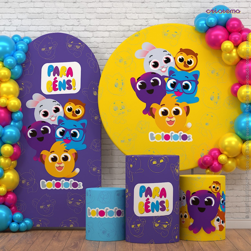 Kit Capa Cilindro e Painel Decoração Festa Bolofofos Aniversário Infantil Em Tecido Sublimado - Licenciado