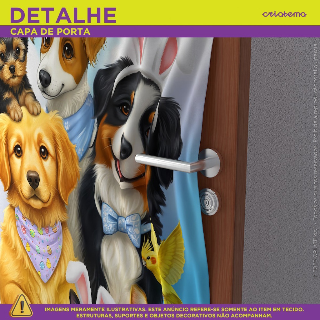 >>> KIT CAPA DE PORTA + FUNDO FOTOGRÁFICO PET EM TECIDO SUBLIMADO <<< Transforme qualquer ambiente em um cenário encantador para fotos e decorações com o Kit Capa de Porta + Fundo Fotográfico Pet da Criatema. Produzidos em tecido especial sublimado, oferecem praticidade, excelente acabamento e imagens nítidas, garantindo um resultado profissional sem reflexos. Ideal para ensaios fotográficos pet, festas temáticas, aniversários, estúdios, pet shops e decorações residenciais. > ITENS INCLUSOS NO KIT 1 Fundo Fotográfico em tecido Malha 1 Capa de Porta Retangular em tecido com acabamento à laser e elástico > FUNDO FOTOGRÁFICO PET Todos os nossos Fundos Fotográficos Sublimados são confeccionados em tecido especial, com excelente acabamento e imagens nítidas que possibilitam fotos incríveis sem reflexos no resultado final. Por serem muito práticos, os fundos podem ser utilizados em estruturas como tripés (presos por garras) ou fixados em paredes e até mesmo em placas de MDF com o auxílio de fita crepe ou dupla face (de formato largo, preferencialmente). CARACTERÍSTICAS DO FUNDO • Tecido: Malha (estica e não amassa) • Composição: 95% Poliéster + 5% Elastano • Gramatura: 140g/m² • Acabamento: Overloque ou corte à laser, conforme demanda, ambos com acabamento perfeito e alta durabilidade > CAPA DE PORTA DECORATIVA EM TECIDO Painel Retangular Porta decorativo em tecido, fácil e prático de utilizar. Dê um toque especial com nossos produtos em tecido! Seja o anfitrião perfeito para sua festa ou crie um ambiente temático em sua casa com praticidade e muito estilo. CARACTERÍSTICAS DA CAPA DE PORTA: • Tamanho Único: 0,85 x 2,10m • Acabamento à laser nas laterais • Elástico superior e inferior facilitando o encaixe • Tecido Malha New (estica e não amassa) • Tecido leve com ótimo caimento • Gramatura: 140g/m de excelente qualidade • Composição: 95% Poliéster + 5% Elastano >>> ATENÇÃO <<< Recomendamos o uso em portas com medida aproximada de 0,80m de largura por 2,10m de altura. BENEFÍCIOS DOS PAINÉIS CRIATEMA • Arte exclusiva • Não amassa (tecido especial) • Não desbota – pode ser lavado quantas vezes desejar • Alta durabilidade • Não reflete luz • Sem emenda • Leve elasticidade Informação complementar: As cores podem variar nas fotografias devido à qualidade da câmera fotográfica, ajustes/configurações da câmera, lente e iluminação do ambiente. Além disso, as configurações brilho e contraste do monitor ou celular onde a imagem está sendo visualizada, também podem dar a impressão das cores serem mais ou menos vivas, mais ou menos intensas. DÚVIDAS FREQUENTES: TRABALHAM COM PERSONALIZAÇÃO? Não! Nós optamos para uma melhor eficiência no processo de postagem do pedido, trabalharmos com produtos prontos. POSSUI GARANTIA? Nosso painel possui garantia contra defeito de fabricação. PRODUTO COM NOTA FISCAL? Todos os produtos acompanham de nota fiscal. >>> Tem alguma dúvida antes de finalizar sua compra? Envie uma mensagem para nós que ajudaremos você! <<<