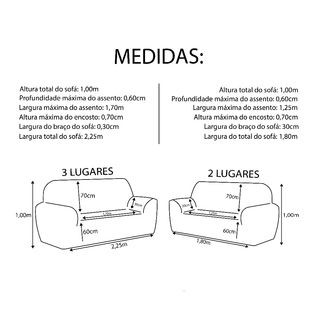 Contém na Embalagem: 01 Capa de Sofá 3 Lugares 01 Capa de Sofá 2 Lugares 01 Cortina Paris 2,00m x 1,70m Medidas: Protetor de 3 Lugares: Altura Total do Sofá: 97cm Profundidade do assento: 55cm Largura máxima do assento: 1,45m Altura máxima do encosto: 70cm Largura máxima do braço: 35cm Altura do assento: 50cm Largura total do sofá: 2,24m Protetor de 2 Lugares: Altura Total do Sofá: 97cm Profundidade do assento: 55cm Largura máxima do assento: 1,10m Altura máxima do encosto: 70cm Largura máxima do braço: 35cm Altura do assento: 50cm Largura total do sofá: 1,79m Composição: Tecido 100% Poliéster
