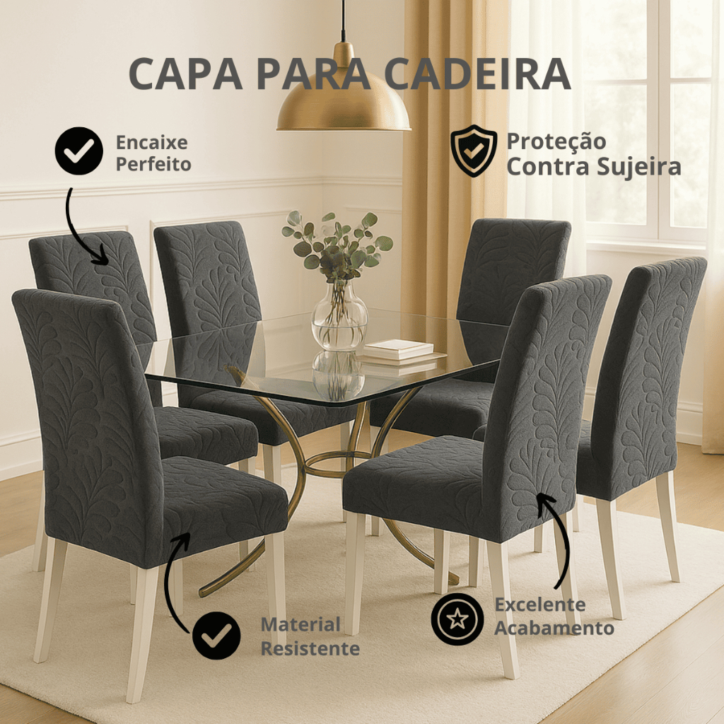 🪑 Capa de Cadeira de Tecido – Proteção, Estilo e Conforto para sua Casa! Renove o visual da sua sala de jantar, escritório ou cozinha com a nossa Capa de Cadeira de Tecido Ajustável. Prática, elegante e resistente, ela é perfeita para proteger suas cadeiras contra sujeiras, desgastes e arranhões, além de dar um toque moderno à decoração. ✅ Benefícios: Protege suas cadeiras contra poeira, manchas e arranhões. Renova o ambiente sem precisar comprar móveis novos. Tecido elástico e lavável, fácil de colocar e remover. Ajuste universal – compatível com a maioria dos modelos de cadeira. Durabilidade e resistência para o dia a dia. 📏 Especificações: Material: Tecido elástico de alta qualidade (poliéster + elastano). Tamanho: Ajustável (indicado para cadeiras com assento de 45-50cm). Cores: Diversas opções para combinar com seu ambiente. Uso: Sala de jantar, cozinha, escritório, eventos, restaurantes etc. ✨ Por que escolher nossa capa? ✔ Protege e prolonga a vida útil das cadeiras ✔ Fácil de lavar e reutilizar ✔ Versátil para qualquer ambiente ✔ Design moderno e sofisticado TABELA DE MEDIDAS: Altura do encosto: 45cm a 50cm Espessura do assento: 4cm a 10cm Comprimento do assento: 36cm a 40cm Largura do assento: 36cm a 40 cm 👉 Garanta já sua Capa de Cadeira de Tecido e dê um novo visual ao seu ambiente sem gastar muito!