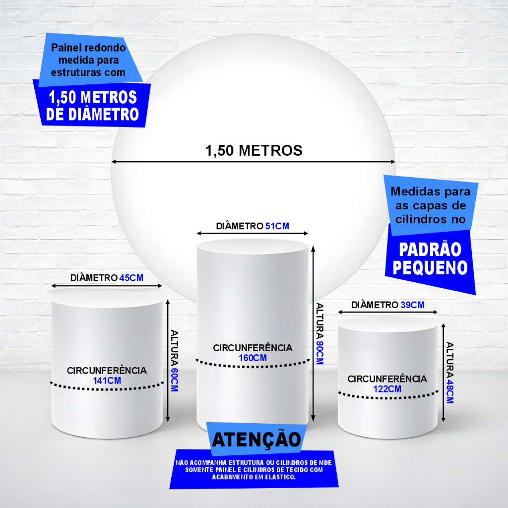 >>>>>> ATENÇAO<<<<<<< KIT DE CAPAS PARA 1 PAINEL REDONDO + 3 CILINDROS (NÃO ACOMPANHA ARO E CILINDRO EM MDF) Nossas capas em tecido helanca premium são desenvolvidos com impressão de alta resolução, garantindo cores vibrantes e um acabamento impecável. *-* Principais Benefícios: * Flexível e ajustável – O tecido possui elasticidade suficiente para se adaptar perfeitamente à estrutura, mas suas fibras retornam ao estado original, evitando deformações ao longo do tempo. * Sem amassados – Diferente de outros materiais, nosso tecido não amassa, mantendo sempre um visual impecável. * Alta gramatura e mínima transparência – Mesmo em tons claros, a alta densidade do tecido reduz significativamente a transparência, garantindo um acabamento profissional. * Fácil de armazenar – Leve, dobrável e compacto, ocupa pouco espaço e pode ser guardado sem dificuldades. * Lavável e secagem rápida – Pode ser lavado sem perder a qualidade, pois tem baixa absorção de água, garantindo uma secagem ágil. * Estampa eterna – A impressão é tão resistente que permanece intacta enquanto o tecido existir. Ideal para eventos, decorações e cenários fotográficos, proporcionando um visual sofisticado e profissional em qualquer ambiente! Importante: Esses efeitos não são visíveis a olho nu, sendo percebidos apenas através das lentes de câmeras. Como funciona? Assim como no cinema 3D, onde a imagem parece turva e tremida sem os óculos especiais, os efeitos impressos seguem o mesmo princípio. Sua verdadeira beleza só pode ser capturada por câmeras , criando um resultado surpreendente. Teste e encante! Se ainda não conhece esses efeitos, faça o teste e veja como as imagens ganham um visual incrível. Atenção: As cores e efeitos podem apresentar pequenas variações dependendo do brilho e da configuração da tela do seu celular ou computador. Transforme sua experiência visual e impressione seu público com imagens deslumbrantes! FICHA TÉCNICA: - Material: Tecido Malha Poliéster Flexível 240g/ml - Composição: 95% Poliéster + 5% elastano - Acabamento: Costura em overlock nas laterais - Impressão: Os produtos são produzidos por meio da impressão sublimada com alta resolução, durabilidade e capacidade de reproduzir cores vivas e detalhes finos - Qualidade: Não reflete luz e não amassa - Garantia: Contra defeito de fabricação MEDIDA PADRÃO Painel Redondo - 1,50 a 1,50 (diâmetro) Capas de Cilindro (3 unidades) - Cilindro grande: Altura: 80 cm X Diâmetro: 50 cm X Circunferência: 157 cm - Cilindro médio: Altura: 58 cm X Diâmetro: 44 cm X Circunferência: 141 cm - Cilindro pequeno: Altura: 45 cm X Diâmetro: 38 cm X Circunferência: 119 cm INSTRUÇÕES DE LAVAGEM - Utilize sabão neutro; - Não torça o tecido - Não coloque em máquinas de lavar; - Para secar, vire do lado avesso em baixa temperatura; - Evite exposição direta ao sol.
