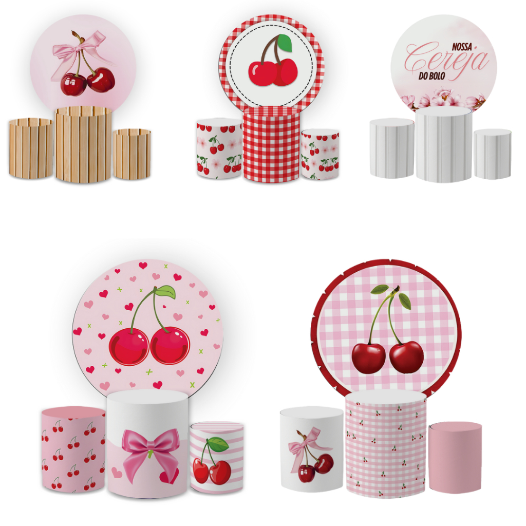 Kit Capa Painel Redondo 1,5 + Trio Cilindros Cereja Decoração Aniversário Infantil