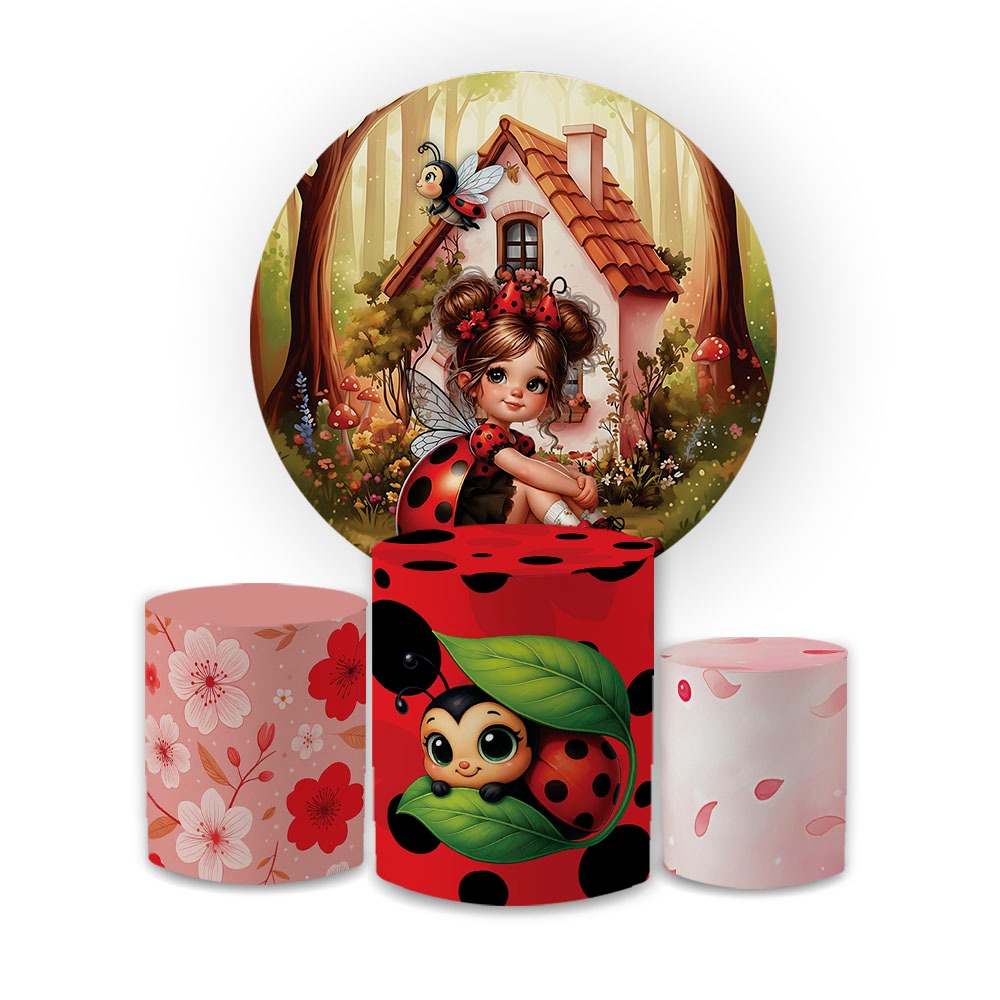 Kit Capa Painel Redondo Grande + Capas Cilindros Festa Infantil Joaninha Menina Aniversario Oferta