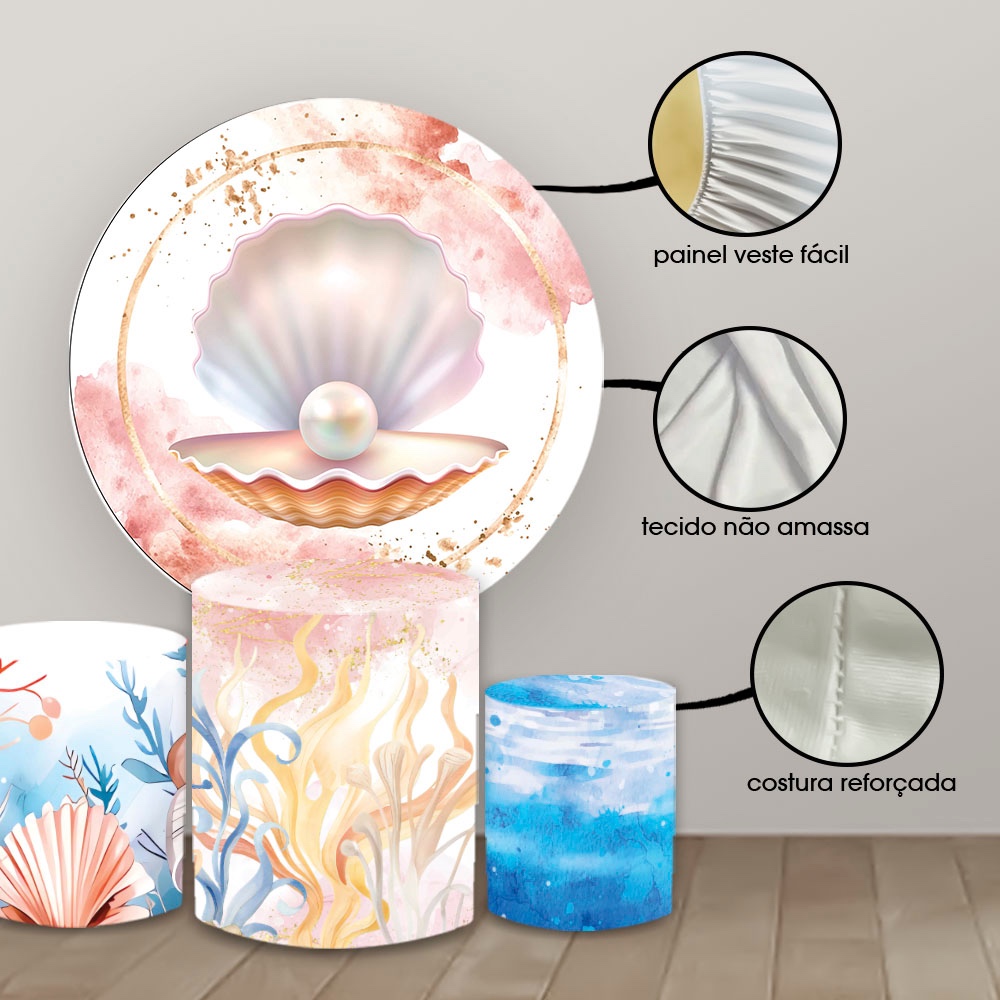 Kit Capa Painel + Trio Capas de Cilindros Sublimado Tema Fundo do Mar infantil concha pérola