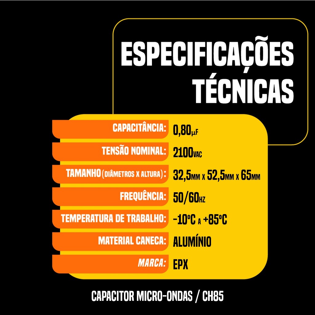 O que inclui: 1un do capacitor microondas 0,80uF, 1un do diodo CL01-12, 1un do fusível de cerâmica 20A e 1un do fusível de vidro 5KV 800mA ********************************************** Capacitância: 0,80uF Tensão nominal: 2100Vac Tamanho: (altura x largura x comprimento): 65mm x 52,5mm x 32,5mm Frequência: 50/60Hz Temperatura de trabalho: -10ºC a +55ºC Material caneca: Alumínio Marca: EPX Aplicações: O capacitor micro-ondas é usado amplamente para micro-ondas de diversas marcas. ********************************************** O Diodo CL01-12 é um componente essencial para reparos e manutenção de micro-ondas, garantindo a correta operação do circuito de alta tensão e proteção do sistema. Modelo: CL01-12 Dimensão: Tensão máxima reversa (PRV): 12V Corrente máxima direta (IF): 1A ********************************************** O Fusível de Cerâmica 20A é a solução ideal para a proteção do seu micro-ondas contra sobrecargas e curtos-circuitos, garantindo maior segurança e durabilidade ao aparelho. Com sua construção em cerâmica de alta qualidade, oferece excelente resistência térmica e elétrica, sendo perfeito para suportar as demandas de corrente elétrica do seu micro-ondas. Corrente Nominal: 20 Amperes Material: Cerâmica Dimensão: Aplicação: Específico para micro-ondas Função: Protege o circuito interno contra picos de corrente, evitando danos ao equipamento. ********************************************** O Fusível de Vidro 5KV 800mA é a escolha ideal para proteger seu micro-ondas contra sobrecargas e curtos-circuitos, oferecendo uma solução eficiente e segura. Com sua construção em vidro de alta qualidade, proporciona excelente resistência elétrica, sendo capaz de suportar tensões de até 5KV. Este fusível é perfeito para garantir o bom funcionamento do seu aparelho, evitando danos ao circuito interno. Tensão Nominal: 5KV Corrente Nominal: 800mA Material: Vidro transparente Dimensão: Aplicação: Específico para micro-ondas Função: Protege o circuito contra picos de corrente e curtos-circuitos ********************************************** ATENÇÃO AO SUBSTITUIR O CAPACITOR/DIODO/FUSÍVEL, VERIFIQUE SE ESTÁ UTILIZANDO O MODELO ESPECIFICADO PELO FABRICANTE NO MANUAL DO SEU EQUIPAMENTO OU NA ETIQUETA DO MOTOR. NÃO ASSUMIREMOS RESPONSABILIDADE PELA INSTALAÇÃO DE UM CAPACITOR INCORRETO EM SEU EQUIPAMENTO. ********************************************** BENEFÍCIOS DO CAPACITOR MICRO-ONDAS EPX Prolonga a vida útil do seu micro-ondas. Reduz os custos com manutenções. Fabricado com materiais de alta qualidade e projetado para atender às mais rigorosas normas de desempenho. Oferece confiabilidade e durabilidade a longo prazo ********************************************** ATENÇÃO PARA OS DADOS DE ENTREGA Confira o seu endereço de entrega cadastrado, não alteramos endereços após a compra Horário de atendimento: Segunda à Sexta das 08h00 às 18h00 ********************************************** ENVIO IMEDIATO COM NOTA FISCAL