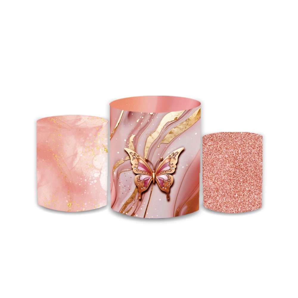 KIT CAPAS PAINEL SUBLIMADO TEMA BORBOLETA ROSA FESTA DE ANIVERSARIO+ TRIO DE CAPAS DE CILINDROS