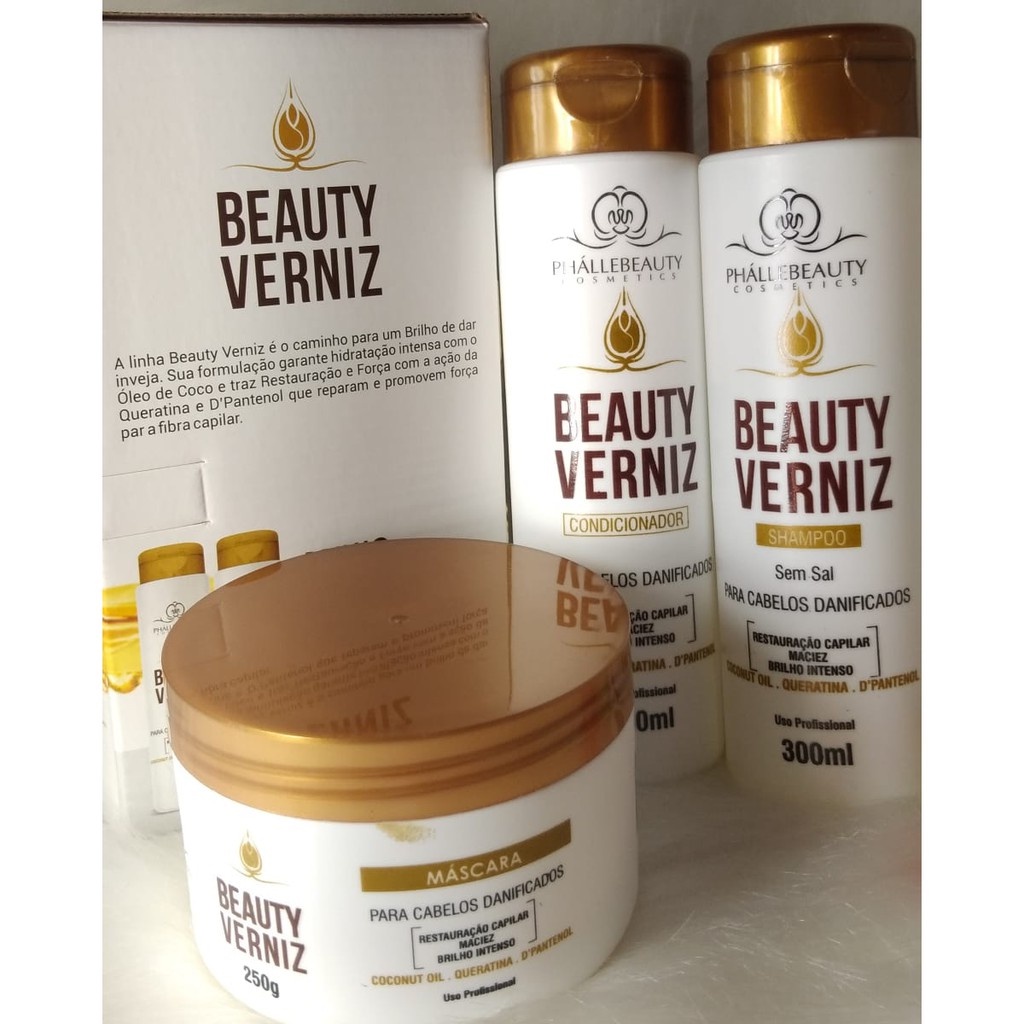 A linha Beauty Verniz PhálleBeauty é o caminho para um Brilho de dar inveja. Sua formulação garante hidratação intensa com o Óleo de coco e traz Restauração e Força com a ação da Queratina e D'Pantenol que reparam e promovem força para a fibra capilar. - Brilho; - Hidratação; - Restauração; - Força. Kit contendo: - 1 Shampoo - 1 Condicionador - 1 Máscara capilar.