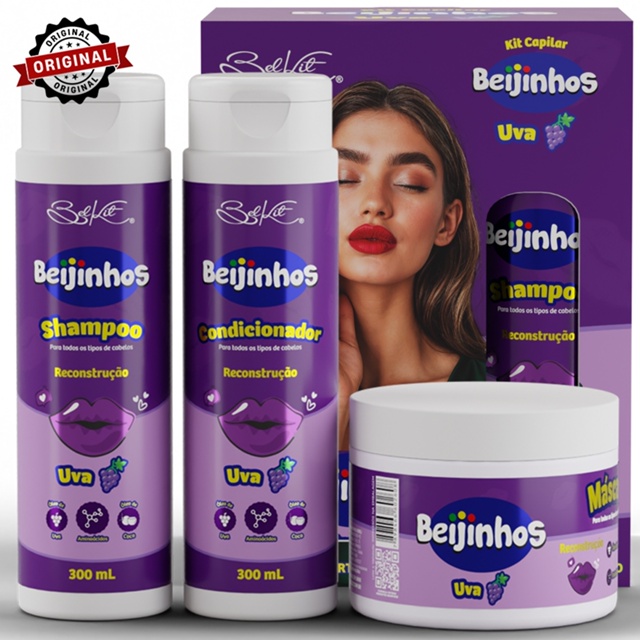 | Kit Capilar Beijinhos de Uva (3 itens) BELKIT | Reconstrução capilar este produto | R$ 23,90 | 32% | 4.9/5 | 105 |