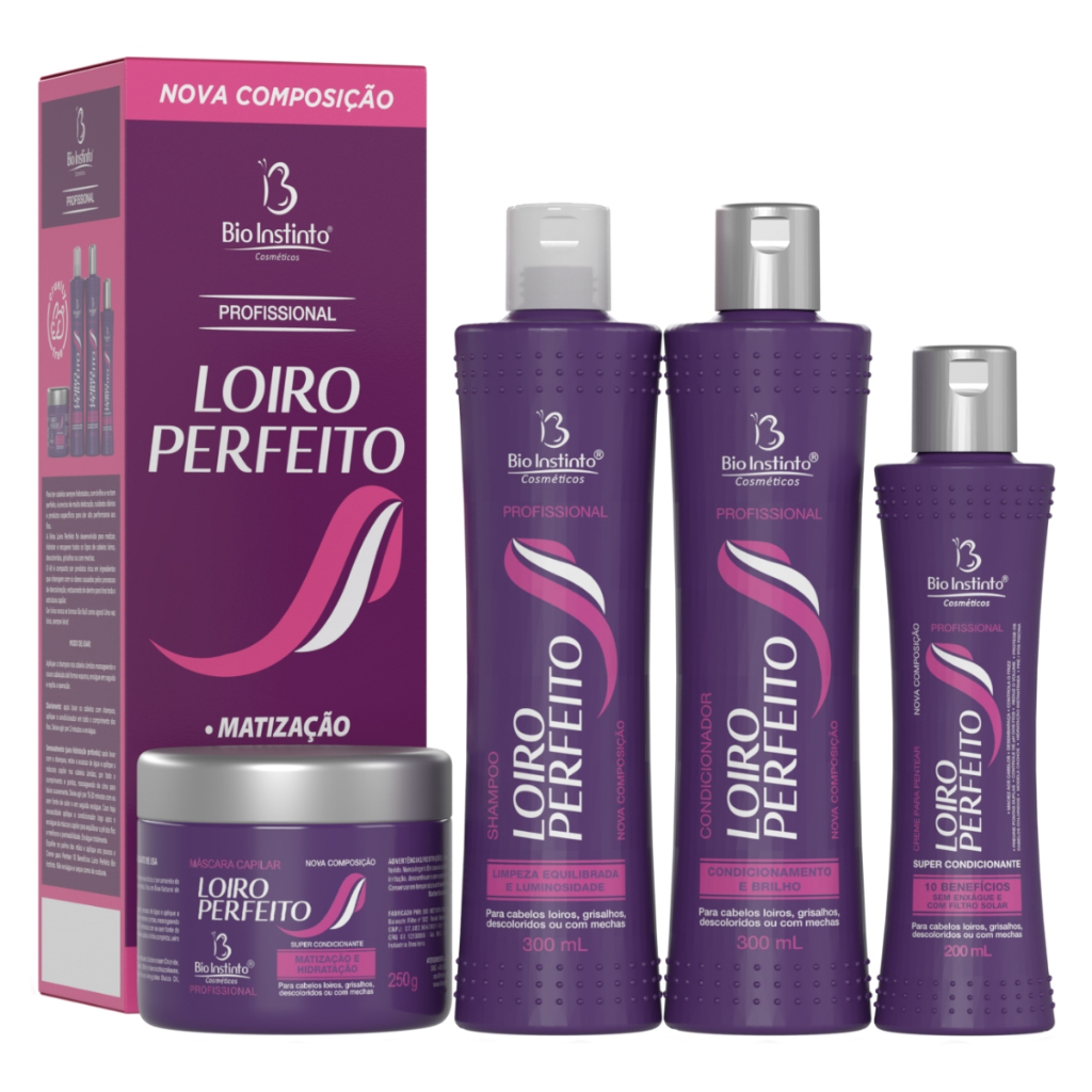 Kit Capilar Loiro Perfeito foi desenvolvida para matizar, hidratar e recuperar todos os tipos de cabelos loiros, descoloridos, grisalhos ou com mechas. Modo de Usar: Aplique o shampoo nos cabelos úmidos massageando o couro cabeludo até formar espuma, enxágue em seguida e repita a operação. Diariamente: após lavar os cabelos com shampoo, aplique o condicionador em todo o comprimento dos fios. Deixe agir por 2 minutos e enxágue. Semanalmente (para hidratação profunda): após lavar com o shampoo, retire o excesso de água e aplique a máscara capilar nos cabelos úmidos, por todo o comprimento e pontas, massageando de cima para baixo suavemente. Deixe agir por 15-20 minutos com ou sem fonte de calor e em seguida enxágue. Caso haja necessidade aplique o condicionador logo após o enxágue da máscara capilar para equilibrar o pH dos fios e melhorar a penteabilidade. Enxágue totalmente. Espalhe na palma das mãos e aplique aos poucos o Creme para Pentear 10 Benefícios Loiro Perfeito Bio Instinto. Não enxágue e seque como de costume. Advertências: Somente para uso externo. Não aplicar em couro cabeludo irritado ou ferido. Nunca ingerir. Em caso de contato com os olhos, lavar com água corrente em abundância. Se houver irritação, descontinuar o uso e procurar orientação médica. Produto não recomendado para uso infantil. Conservar em temperatura ambiente inferior a 40°C, em local fresco e longe da luz solar. Manter fora do alcance de crianças e animais domésticos. 1 KIT CONTÉM 4 ITENS.