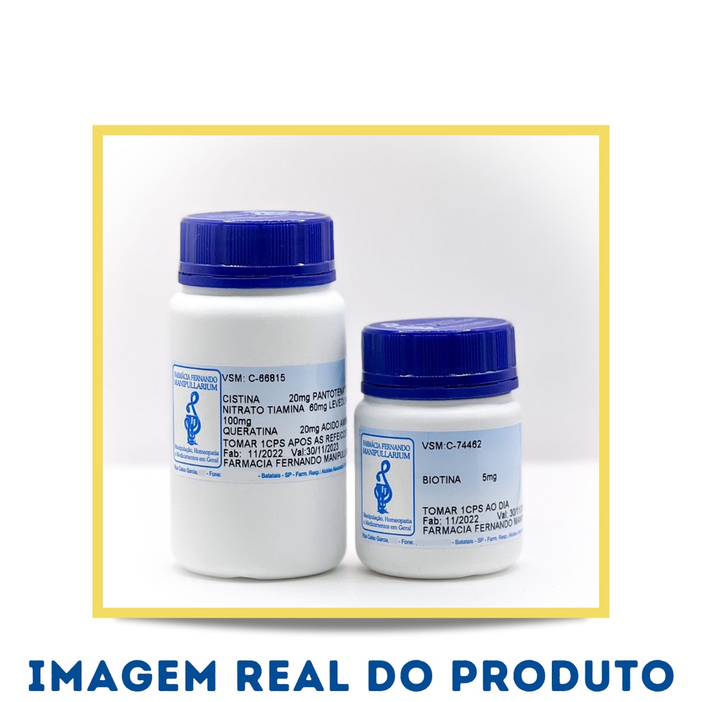 Bem-vindo a Farmácia Fernando Manipullarium, estamos no mercado há mais de 125 anos, trabalhamos somente com fornecedores certificados e produtos de qualidade. É um prazer te atender! ______________________________________ Você recebe neste kit: 1un. Biotina 5mg 60 CPS – Vitamina essencial para estrutura dos fios 1un. Pantotenato com Biotina 60 CPS – Vitamina para cabelo, pele e unha. ✅ FÓRMULA MANIPULADA ✅ QUALIDADE GARANTIDA ✅ COM NOTA FISCAL ✅ ENVIO EM 24 HORAS Ficou com dúvida? Chame a gente no chat! Será um prazer te atender! ______________________________________ - COMPOSIÇÃO POR CÁPSULA (Pantotenato): Biotina 0,5mg Pantotenato de cálcio 60 mg Cistina 20 mg Vitamina B1 60 mg Levedura de cervej 100 mg Queratina 20 mg Paba (Ácido aminobenzóico) 20 mg Excipiente qsp. (SEM GLÚTEN - SEM LACTOSE) - COMPOSIÇÃO POR CÁPSULA (Biotina): Biotina 5mg Excipiente qsp. (SEM GLÚTEN - SEM LACTOSE) ______________________________________ - SUGESTÃO DE USO (Pantotenato): Tomar 1CPS 2xx/dia, após as refeições. - SUGESTÃO DE USO (Biotina): Tomar 1CPS 1x/dia. ______________________________________ - VALIDADE: 12 MESES, A PARTIR DA DATA DE FABRICAÇÃO. Fique tranquilo, você receberá em sua casa uma produção recente! ______________________________________ - CONSERVAÇÃO: Após aberto, manter a embalagem bem fechada e armazenar em local fresco, seco (15° a 25°) e ao abrigo de luz. Produto lacrado para sua proteção. Não utilizar em caso de violação. Manter fora do alcance de crianças. ______________________________________ - ADVERTÊNCIAS: Gestantes, idosos, crianças, lactantes e pessoas que apresentam doenças ou alterações fisiológicas, somente devem consumir este produto sob orientação. ______________________________________ - REFERÊNCIAS: Literaturas de fornecedores. ______________________________________ ''ISENTO conforme resolução RDC 27 de 06 de agosto de 2010 anexo I.'' Este produto não deve ser utilizado por menores de 18 anos sem orientação. Imagens meramente ilustrativas. Os resultados e indicações referentes ao uso desse produto foram avaliados e comprovados pelo fabricante deste insumo farmacêutico. Não garantimos os resultados descritos, estes variam de pessoa para pessoa dependendo de diversos fatores como alimentação, prática de exercícios físicos, presença de outras patologias, bem como, o uso correto do produto conforme descrito na posologia.”