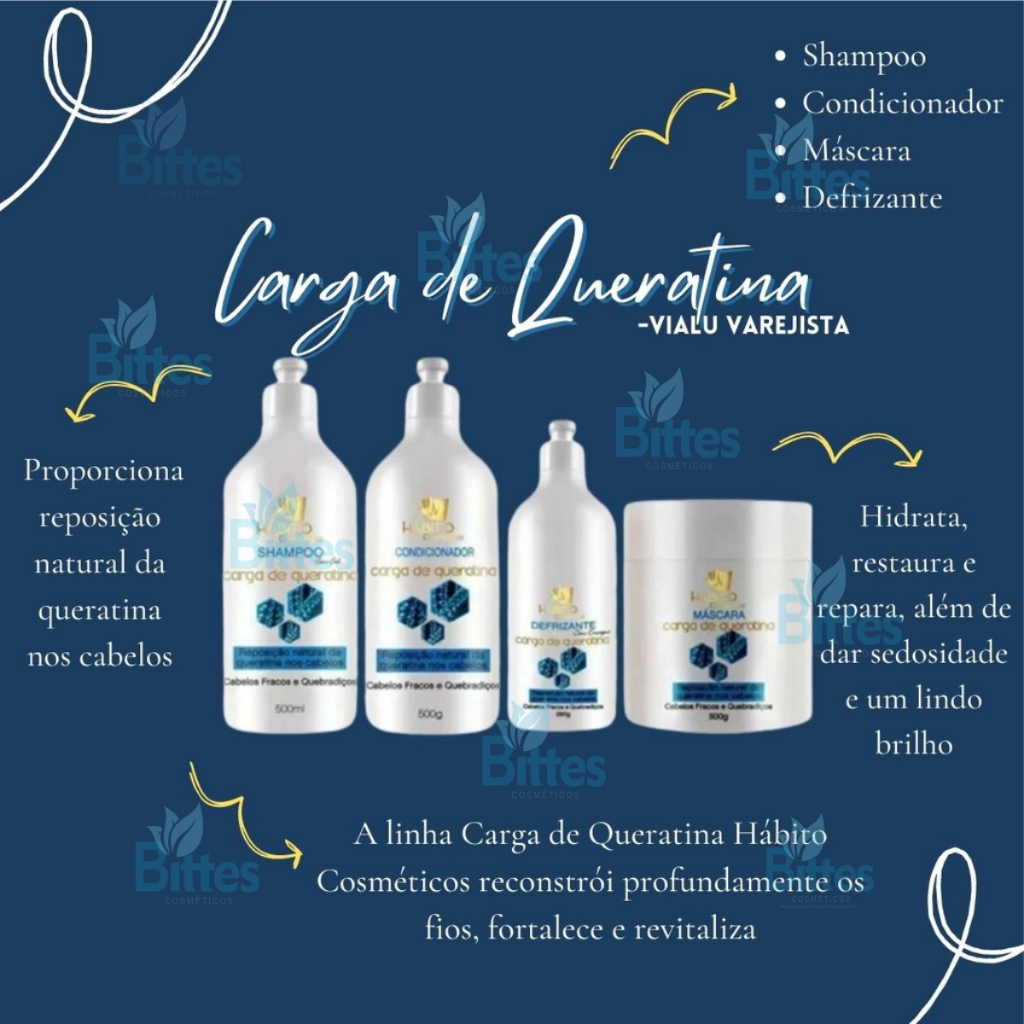 Kit Carga De Queratina Hábito Cosméticos Reposição de Queratina RECONSTRUÇÃO E QUERATINIZAÇÃO O cabelo já possui normalmente a queratina, mas devido às agressões químicas — coloração, poluição, descoloração, cloro e raios solares — ele acaba perdendo essa proteína. Por isso é importante fazer a reposição nos fios. O Shampoo promove força máxima aos cabelos quebradiços e danificados. Garantindo maior resistência e beleza aos fios. O Condicionador repara os cabelos proporcionado brilho e maciez. A Máscara reconstrói e sela a camada externa dos fios, reduz as pontas duplas e repõe a queratina perdida durante processos químicos. O Defrizante nutre e amacia, promovendo brilho radiante. Fórmula sem corante e sem adição de sal Produto notificado na ANVISA. Produto a pronta entrega. Envio imediato! Empacotamento: O produto é lacrado direto da indústria, e reforçado com fita adesiva, para suportar o transporte sem vazamento, empacotada e reforçada com caixa de papelão, para que seu pacote chegue intacto pronto para uso ou revenda! Seu pedido contém: 1 Shampoo de 500 ml 1 Condicionador 500 ml 1 Máscara 500 g 1 Defrizante 280 g