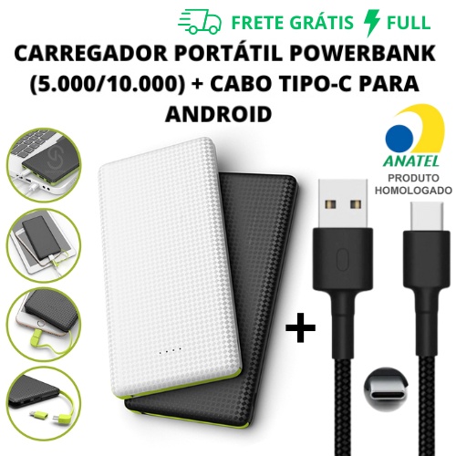 KIT CARREGADOR PORTÁTIL POWER BANK (5.000 / 10.000 MAH) + CABO TIPO-C PARA ANDROID