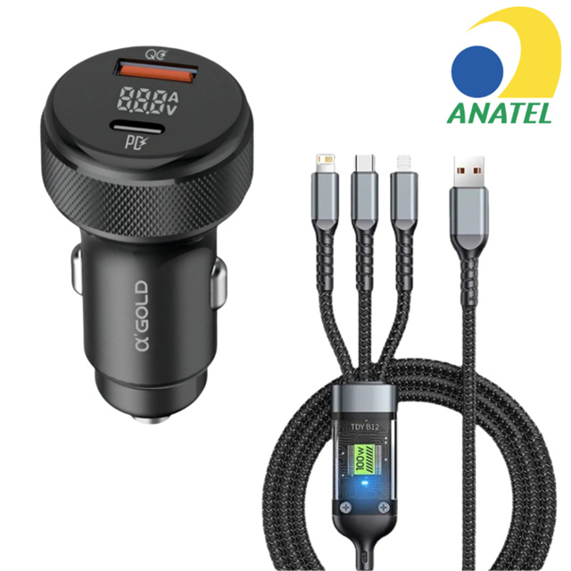 Kit Carregador Veicular Turbo 9.1A 60 W Com Exibição De Led + Cabo de Dados Celular 3 em 1 100W IOS