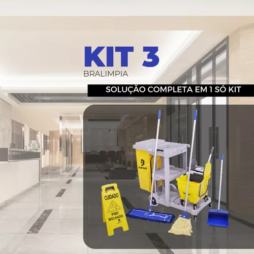 KIT NÚMERO 3 BRALIMPIA======================================INFORMAÇÕES SOBRE O PRODUTO======================================Um kit que proporciona solução completa para a limpeza de pisos frios em geral e outras superfícies. O Carro Funcional América transporta com praticidade todos os equipamentos e acessórios necessários para a limpeza do dia a dia.O Balde Doblô 30 Litros com sistema de 2 águas, uma para solução limpadora e outra para água limpa, aumenta a produtividade permitindo que os operadores efetuem a limpeza de uma área muito maior quando comparado com outros sistemas de limpeza.O Conjunto Mop Pó e a Pá Pop retiram as partículas com eficiência dos ambientes prevenindo que voltem a se depositar causando danos e doenças. A Placa Sinalizadora auxilia na prevenção de acidentes, como escorregões e quedas nos ambientes que estão sendo limpos.======================================Kit composto pelos seguintes itens:======================================-Carro Funcional América-Balde Doblô 30 litros – 2 águas-Cabo alumínio – 1,40 m-Garra Euro Plástica-Refil Loop com cinta – 320g-Placa Sinalizadora Piso Molhado-Pá Pop-Conjunto Mop Pó – 60 cm======================LOJA======================- O grupo Soluwan possui loja física e online a mais de 29 anos satisfazendo nossos clientes.- Vendemos somente produtos novos e de qualidade garantida.- Despachamos em 24 horas.- Entregamos para todo o BRASIL.#kitdelimpezaprofissionalbralimpia #carrinhodelimpezaprofissional #carrofuncionalcompleto #carrinhofuncionallimpeza #carrinhofuncionalbralimpia #kit3 #NYKT03 #limpeza #bralimpia #carrinhobralimpia