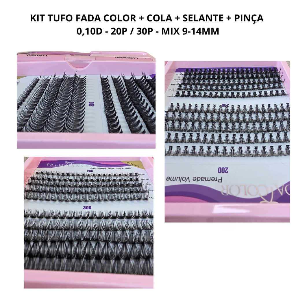 Kit Cartela Cílios Tufo + Cola + Selante + Pinça Fada Color 20P e 30P Mix 9mm - 14mm