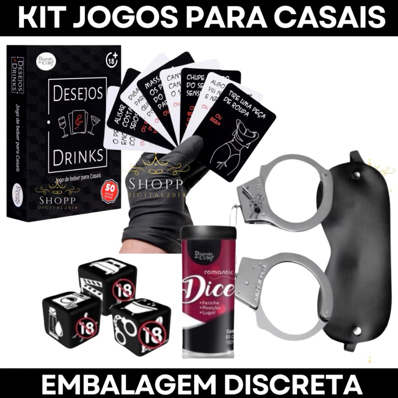 Kit Casal Sex Shop Baralho erótico Desejos e Drinks + Dados Eróticos + Venda tapa Olhos + Algema