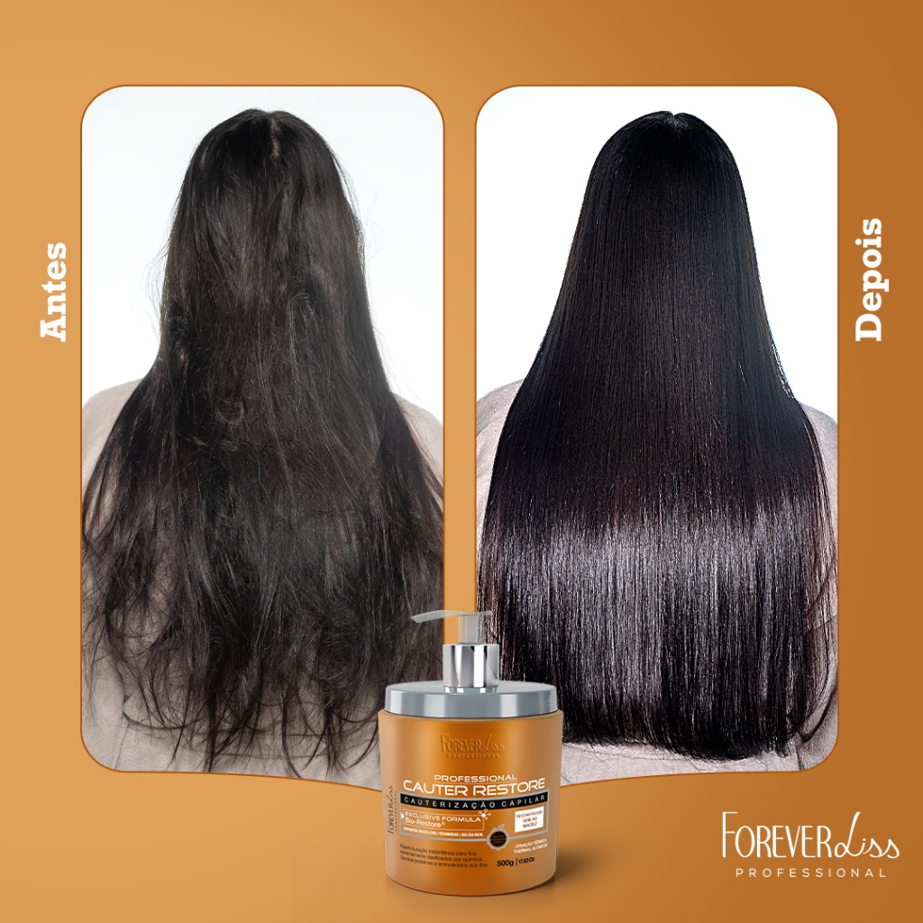 A Máscara Capilar Cauter Restore Forever Liss 500g forma uma barreira protetora nos cabelos aumentando a resistência mecânica do fio, possui extrema habilidade de reposição da massa cortical, reparando e reconstruindo toda área fragmentada por uso exagerado de produtos químicos. A Blindagem Biomimética Forever Liss 500g Máscara de reparação intensiva. Possui um blend de ativos ricos em proteínas e vitaminas, tem ação antioxidante, formadora de filme, disciplinante e suavizante da cutícula capilar. Repõe todos os nutrientes perdidos por processos químicos, deixando os fios soltos, macios e com brilho. Indicação: Indicado para todos os tipos de cabelo. Principalmente danificados por químicas, fontes de calor e fios porosos. Modo de uso: Cauter Restore: 01. Logo após lavar os cabelos, aplique a Máscara Cauter restore nos fios ainda úmidos, espalhando em todo o comprimento; 02. Massageie mecha por mecha enluvando; 03. Deixe agir por 5 minutos e enxágue até retirar o produto por completo; 04. Finalize com uma fonte de calor. Blindagem Capilar: 01. Logo após lavar os cabelos, aplique a Máscara Blindagem capilar nos fios ainda úmidos, espalhando em todo o comprimento; 02. Massageie mecha por mecha enluvando; 03. Deixe agir por 5 minutos e enxágue até retirar o produto por completo; 04. Finalize com uma fonte de calor. Contém: 01 - Cauterização Capilar Cauter Restore 500g 01 - Blindagem Biomimética Passo Único Forever Liss 500g Precauções: Mantenha fora do alcance de crianças. Uso externo adulto. Evite a exposição do produto a raios solares e calor intenso. Em caso de contato com os olhos, enxágue imediatamente e abundantemente com água. Havendo irritação, suspenda o uso. Caso a irritação persista, procure orientação médica. Após o uso, mantenha a embalagem fechada. Uso estritamente profissional. Principais Dúvidas: 01. Qual o pH das Máscaras Cauter Restore e Blindagem Forever Liss? R. O pH da Máscara Cauter é 3,8 - 5,2. 02. A máscara Cauter Restore e blindagem entra em qual etapa do cronograma capilar? R. A máscara Cauter e blindagem entra na etapa de reconstrução do cronograma. 03. Quantas vezes posso utilizar a Máscara cauter e blindagem na semana? R. Em cabelos muito danificados pode ser utilizada 1x na semana. Cabelos saudáveis a cada 15 dias. 04. Gestantes, lactantes e crianças podem utilizar? R. Sim! O produto não contém restrição de uso.