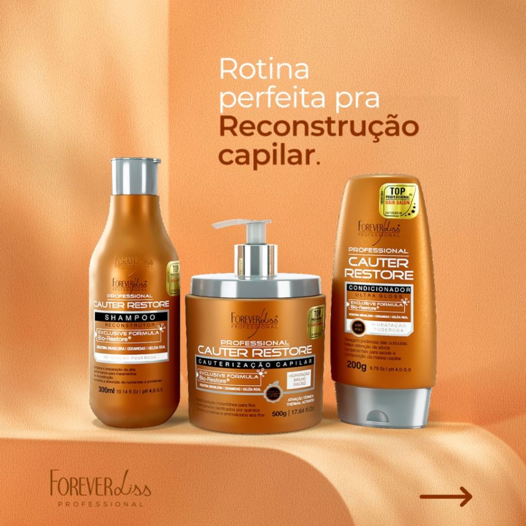 Kit Cauterização Completa Cauter Restore Forever Liss é um tratamento potencializado para reconstruir e repor nutrientes em fios danificados, secos e porosos por excesso de químicas. O Shampoo Cauterização Cauter Restore Forever Liss 300ml promove limpeza suave com preparação de alta performance. A Máscara Capilar Cauterização Cauter Restore 500g especial termo ativada possui extrema habilidade de reposição da massa cortical, reparando e reconstruindo toda área fragmentada por uso exagerado de produtos químicos. O Condicionador Cauterização Cauter Restore 200g promove a estruturação da fibra capilar. Indicação: Indicada para todos os tipos de cabelos, principalmente os porosos, danificados e quimicamente tratados. Modo de uso: 01. Com os cabelos úmidos ou molhados aplique o Shampoo Reconstrutor massageando gentilmente o couro cabeludo com a ponta dos dedos até que se forme uma espuma. Enxágue; 02. Repita o processo e deixe agir por 3 minutos; 03. Enxague abundantemente; 04. Aplique a Máscara Cauter Restore e distribua uniformemente, massageando suavemente mecha por mecha enluvando; 05. Deixe agir por 5 minutos e enxágue normalmente; 06. Retire o excesso de água e aplique o Condicionador Cauter, massageando-os mecha a mecha; 07. Deixe agir por 5 minutos; 08. Enxágue completamente; Contém: 01 - Shampoo Cauterização Cauter Restore Forever Liss 300ml 01 - Máscara Capilar Cauterização Cauter Restore 500g 01 - Condicionador Cauterização Cauter Restore 200g Precauções: Manter em temperatura ambiente, em local seco e ao abrigo de luz. Uso externo adulto. Em caso de contato acidental com os olhos, enxaguar abundantemente. Havendo irritação, suspenda o uso. Caso a irritação persista, procure orientação médica. Não ingerir. Manter fora do alcance de crianças. Principais Dúvidas: 01. Qual o pH do Kit Cauterização Completa Cauter Restore Forever Liss? R. O pH do shampoo é de 4,5 - 5,5 da Máscara é 3,8 - 5,2 e o Condicionador é 4.0 a 5.0 02. O Kit Cauterização Completa Cauter Restore Forever Liss entra em qual etapa do cronograma capilar? R. A máscara entra na etapa de reconstrução do cronograma capilar. 03. Quantas vezes posso utilizar o Kit Cauterização Completa Cauter Restore Forever Liss na semana? R. O shampoo e condicionador podem ser utilizados diariamente. A máscara em cabelos muito danificados pode ser utilizada 1x na semana. Cabelos saudáveis a cada 15 dias. Para um cabelo que necessita de reconstrução, o Spray Finalizador poderá ser usado 1x na semana. 04. Gestantes e lactantes podem utilizar? R. Não há contraindicações, porém em caso de dúvidas o médico deverá ser consultado