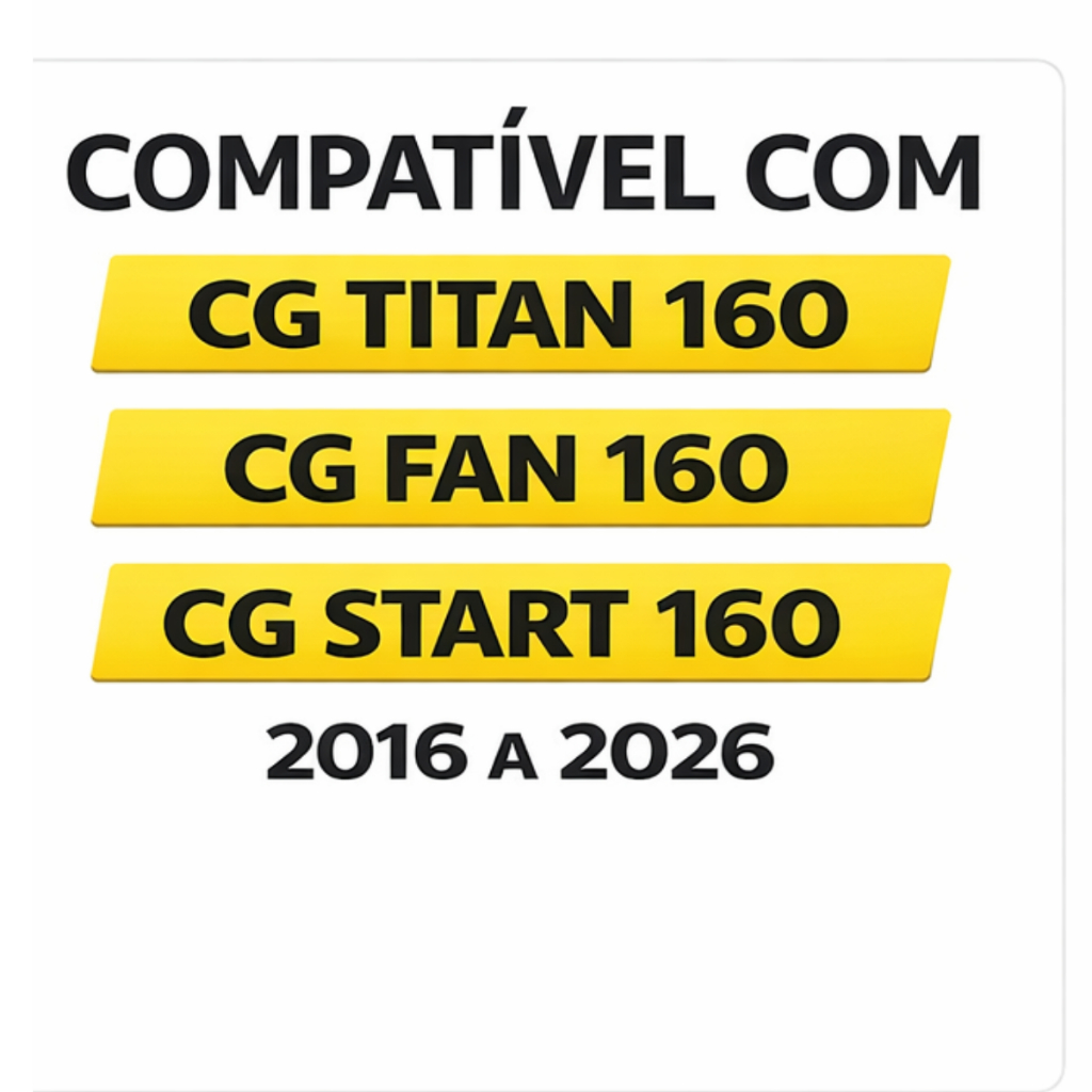 Kit Cavalete Central CG 160 Titan Fan Start 2016 a 2026 – Completo com Mola, Eixo, Meia Lua e Batente – Aço Reforçado Preto ================ COMPATIBILIDADE ================ Honda CG Titan 160 – 2016 a 2026 Honda CG Fan 160 – 2016 a 2026 Honda CG Start 160 – 2016 a 2026 Aplicação perfeita nos modelos 160cc. Encaixe padrão original. ================ CONTEÚDO DO KIT ================ • 1 Cavalete Central Reforçado Preto • 1 Eixo do Cavalete com Cupilha • 1 Mola do Cavalete Central • 1 Meia Lua • 1 Borracha Batente ================ BENEFÍCIOS ================ • Encaixe padrão original – sem adaptações • Aço reforçado – alta durabilidade • Excelente estabilidade ao estacionar • Ideal para uso diário e trabalho • Produto novo com excelente acabamento Envio rápido com nota fiscal.