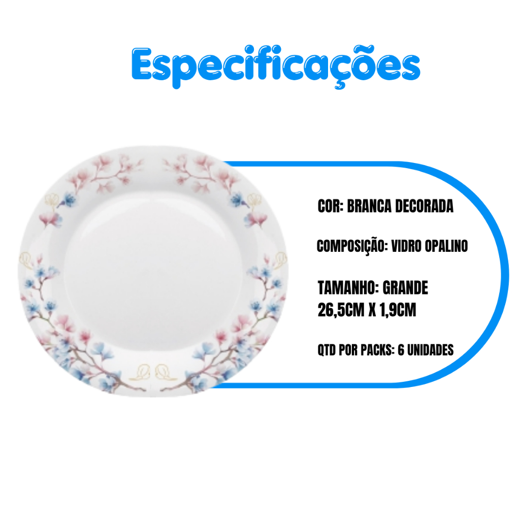 PRATO DECORADO OPALINE CELESTE – BELEZA E DURABILIDADE PARA O DIA A DIA Transforme suas refeições com o charme e a sofisticação dos Pratos Decorados Celeste. Produzidos em vidro opalino, combinam leveza, resistência e um brilho delicado que realça as estampas modernas e exclusivas. Perfeitos para compor mesas elegantes em qualquer ocasião, esses pratos mantêm a praticidade no uso e na limpeza, sendo ideais tanto para o uso doméstico quanto profissional. Disponível em diferentes tamanhos e formatos, você pode escolher o kit ideal conforme a sua necessidade: prato raso, fundo ou sobremesa. 🔹 PRINCIPAIS BENEFÍCIOS: • Design decorado com acabamento sofisticado • Fabricado em vidro opalino resistente • Fácil de limpar – compatível com lava-louças • Ideal para refeições completas, entradas ou sobremesas • Não mancha, não absorve odores e mantém o brilho por muito mais tempo 📦 ITENS INCLUSOS: Kit com 6 pratos decorados Embalagem protegida e pronta para transporte seguro 📐 OPÇÕES DE TAMANHOS (escolha a variação desejada): • Prato Fundo – 21,5cm x 3,2cm (Ref. CLT-083) • Prato Pequeno – 19cm x 1,6cm (Ref. CLT-073) • Prato Médio – 25cm x 2,7cm (Ref. CLT-063) • Prato Grande – 26,5cm x 1,9cm (Ref. CLT-053) 🧾 ESPECIFICAÇÕES TÉCNICAS: • Composição: Vidro Opalino • Cor: Branco decorado • Marca: Celeste • Uso: Refeições, decoração, sobremesas • Compatível com lava-louças • Armazenagem: Local seco e limpo