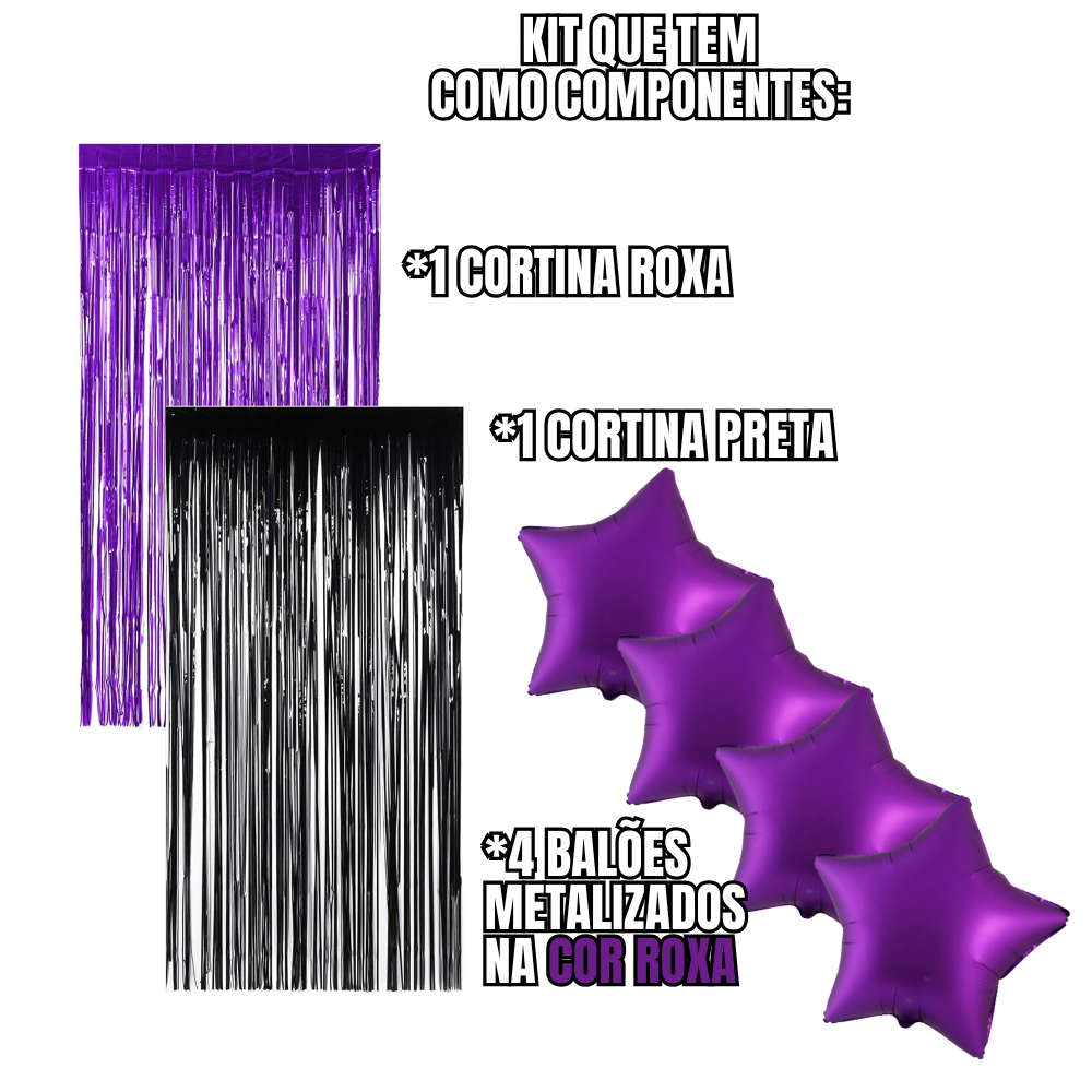 Kit: 2 Cortinas + 4 Balões Estrelas Cortinas Cor: Roxo / 2-unidades Tamanho : 1x2 Balões : Cor: Roxo / 4-Unidades Tamanho: 45cm Material: Polietileno e Folha Metalizada Kit Completo para sua festa com Painel e Balões ideal para decoração de Festas de Aniversário Envio rápido *ATENÇÃO* imagem ilustrativa, somente vai no kit são as 2 cortinas e os 4 balões. O kit ideal para sua festa temática. !!!!!!! DUVIDAS CHAMA-NOS NO CHAT !!!!!!