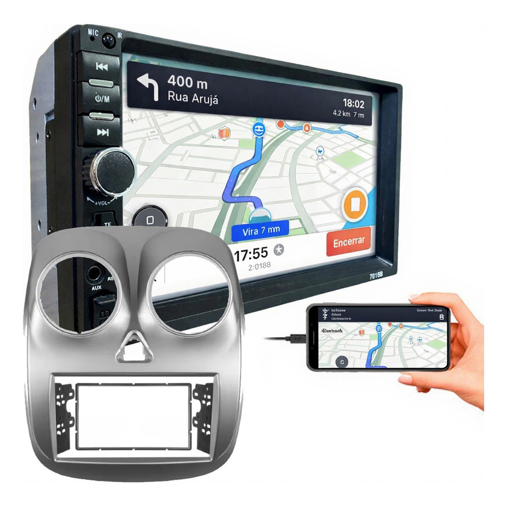 KIT MOLDURA + CENTRAL MULTIMIDIA • Especificações Técnicas: - Tela 7 Polegadas capacitiva - Espelhamento Android e iOS - Bluetooth - Entrada para cabo P2 - Rádio FM - Tela Full Touch - Entrada SD Card - Entrada USB - Controle Remoto - Saída de Áudio 4×45 - Entrada para Câmera de Ré A nossa moldura Fiat Palio possui um padrão 2 din e tamanho de 7 polegadas. É fabricada em plástico ABS (acrilonitrila butadieno estireno), o que garante maior resistência a impactos e a temperaturas extremas. Esta moldura 2 din Fiat Palio está disponível nas cores prata, preto com acabamento fosco e preto com acabamento em verniz. É compatível com o Fiat Palio Attractive 2012 – 2017.