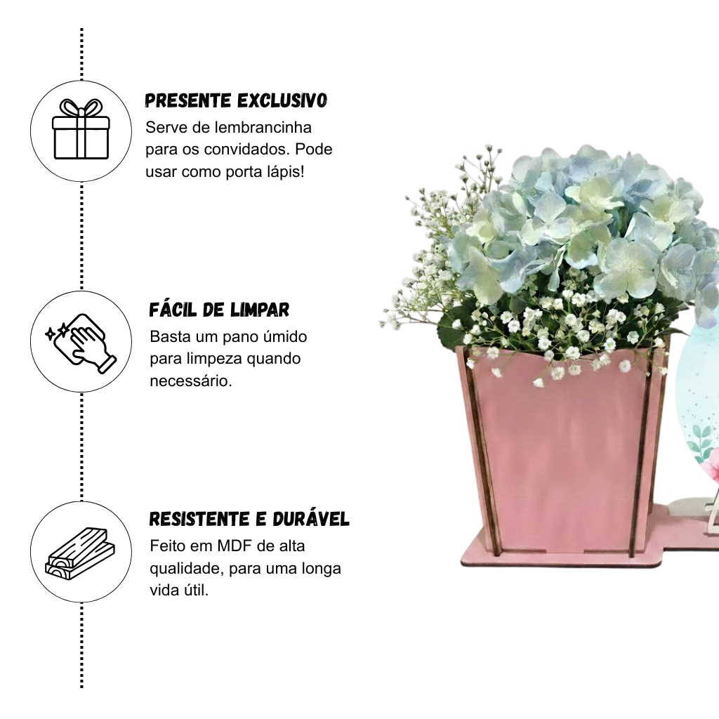 Kit Centro De Mesa Cachepô Adesivado Estampado Personalizado Tema Moana Baby, Enfeite De Festa, Decoração De Festa, Lembrancinha De Festa, Vaso De Flores, Para Festas, Kit Para Decoração, Porta Lápis Em MDF. • Após a compra, por favor nos enviar o nome para personalização • Escolha a quantidade e a estampa desejada no ato da compra • Cor: Rosa • Kit com 10, 15, 20, 25, 30, 35 unidades CARACTERÍSTICAS DO PRODUTO: • Material: MDF de 3mm • Pintura: Tinta exclusiva para MDF, garantindo um acabamento impecável • Estampa: 7 modelos disponíveis • Medidas externas: 14cm de altura x 22cm de comprimento • Para vaso de até tamanho 9 • Corte a laser de alta precisão, garantindo encaixe perfeito das peças BENEFÍCIOS DO PRODUTO • Excelente centro de mesa para decorações de festas. Além disso, serve como lembrancinha. • Nosso centro de mesa é feito em MDF de alta qualidade, garantindo durabilidade. • A pintura com tinta exclusiva para MDF garante que o produto tenha um aspecto impecável e proteção da madeira • Não necessita cola para montagem • Impressão de altíssima qualidade no display garantindo nitidez da imagem • As flores nas imagens são ilustrativas, portanto não acompanham o produto PERGUNTAS FREQUENTES: • QUANTO TEMPO PARA EU RECEBER O PRODUTO EM MINHA CASA? Na hora da compra, aparecerá para você a data prevista de entrega. Normalmente a entrega da Shopee costuma ser bem rápida, chegando até antes da data prevista. • QUANTO TEMPO DE PRODUÇÃO PARA FAZER O ENVIO (POSTAGEM)? Nossos produtos contam com estoque, então nosso envio é imediato! Comprou, fazemos a postagem no mesmo dia ou no próximo dia útil. • COMPREI O KIT COM 20 UNIDADES, DA PRA FAZER 10 ROSA E 10 LILÁS? Sim! Você pode escolher mais de uma cor. Basta enviar a quantidade e as cores desejadas via chat. • POSSO FAZER NOME COMPOSTO? Sim! Fazemos nome e sobrenome caso deseje. • POSSO COLOCAR A IDADE? Sim! Pode colocar o primeiro nome e a idade juntos. >>>>>>>>> ATENÇÃO <<<<<<<<< Somos fabricantes de produtos personalizados, mas o nosso envio é imediato! Para garantir o cumprimento do prazo de envio estabelecido pela plataforma e uma logística eficiente, pedimos que nos envie as informações de personalização já no ato da compra. Pode ser via observação de compra ou via chat. Caso o comprador não enviar as informações a tempo, o produto será enviado sem personalização. Caso haja outras dúvidas, nos contate pelo chat. Teremos o maior prazer em atendê-los! O IMPÉRIO DO MDF