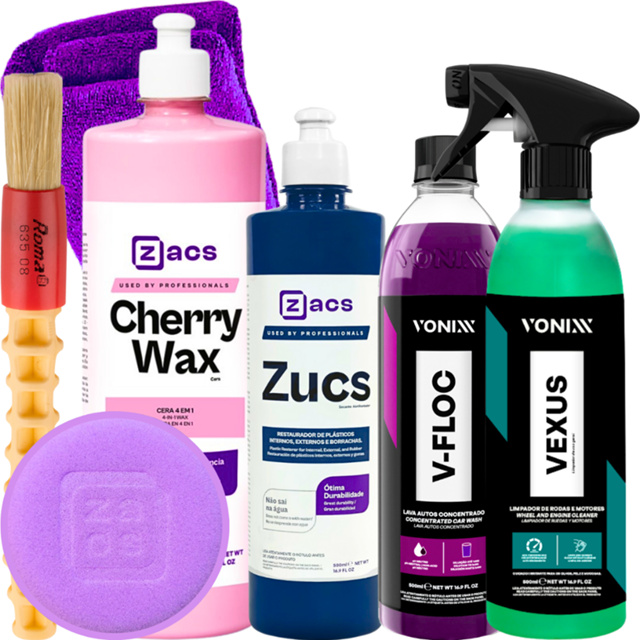 KIT CONTÉM: VEXUS 500ML CHERRY WAX 1L ZACS ZUCS 500ML V-FLOC 500ML APLICADOR DE ESPUMA PINCEL ROMA PANO 40X40CM ------------------------------------------------------- CHERRY WAX 1L - CERA 4 EM 1 ZACS DESCRIÇÃO: Cherry Wax é uma cera 4 em 1 desenvolvida para limpar, mascarar leves defeitos, proteger e promover brilho impecável na pintura veicular. É uma cera muito fácil de aplicar, com ótimo custo-benefício e aromatizada com fragrância de cereja MODO DE USO: 1. Agite bem antes de usar 2. Aplique o produto uniformemente com um aplicador de espuma ou microfibra em toda pintura 3. Após pelo menos 5 minutos, faça a remoção para promover acabamento de lustro utilizando uma toalha de microfibra limpa, macia e seca ------------------------------------------------------- VEXUS 500ML - LIMPADOR DE RODAS E MOTORES DESCRIÇÃO: Vexus é um limpador de alta performance, desenvolvido especialmente para limpeza de rodas e motores. O produto age na remoção da sujeira sem agredir as rodas e as partes do motor, seja plástico, pintura, borracha ou metal. - ALTA PERFORMANCE - NÃO AGRIDE MODO DE USO: 1. Pulverize uma pequena quantidade de produto na superfície fria 2. Com o auxílio de escova ou pincel, faça a esfregação até notar o desprendimento da sujeira 3. Utilizando um jato d’água faça o enxágue por completo e em seguida a secagem ------------------------------------------------------- ZUCS 500ML ZACS DESCRIÇÃO: Zucs é um restaurador de plásticos 3 em 1 desenvolvido para plásticos internos, externos e borrachas em geral. O produto tem em sua composição de SiO2 e polímeros de última geração, que renova e protege plásticos e borrachas de veículos em geral. Poderá durar até 8 meses nos plásticos internos e 3 meses nos plásticos externos. MODO DE USO: 1. Certifique-se que a superfície esteja limpa e seca. 2. Com o auxílio de um aplicador de espuma ou de microfibra, aplique uniformemente o produto com movimentos circulares até perceber a completa restauração. 3. Observe o acabamento e se necessário, repita a operação. OBSERVAÇÃO: Você poderá regular o nível de brilho da aplicação. A aplicação em pequena quantidade e aplicador de microfibra dará menos brilho e ficará com aspecto mais parecido com uma peça original. Para quem busca acabamento mais brilhante, a aplicação deverá ser feita com aplicador de espuma e em maior quantidade. ------------------------------------------------------- V-FLOC 500ML - LAVA AUTOS SUPER CONCENTRADO DESCRIÇÃO: V-Floc é um lava autos de alta performance e de pH neutro. Sua fórmula contém agentes condicionadores e tensoativos especiais que proporcionam uma lavagem suave e eficiente. MODO DE USO: 1. Realizar a pré-lavagem do veículo para retirada do excesso de sujeira 2. Diluir aproximadamente 10ml de V-FLOC em 4 litros de água; Recomendamos ajustar a quantidade de produto de acordo com o nível de sujeira 3. Iniciar a lavagem com o auxílio de Luva de Microfibra, sempre começando pela parte superior do veículo 4. Mergulhar a luva na solução e esfregar suavemente, até completar todo o veículo 5. Enxaguar em seguida até a retirada de todo o produto 6. Recomendamos o uso da Toalha de Secagem para finalizar