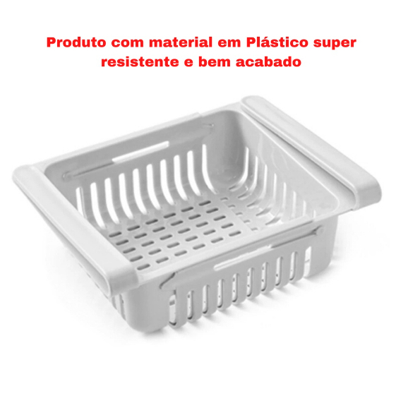 * A Cesta Organizadora de Geladeira vai te surpreender ao criar mais espaço na sua geladeira! * Ela organiza e guarda comidas, bebidas, frutas, ovos, lanches e muito mais. Possui pequenos furos em sua estrutura que garantem maior ventilação para melhor conservar os alimentos, mantendo a permeabilidade ao ar enquanto aumenta a propriedade antibacteriana dentro do seu refrigerador. Fácil de limpar e secar. * Além disso, o design leve e resistente faz com que possa ser utilizada em diversos ambientes como bancadas de cozinha, prateleiras ou mesas com espessura de até 1,5cm, proporcionando mais espaço livre * Ideal para organizar alimentos, bebida, frutas, etc. Recipiente de alimento de leve e durável, extensível projeto de construção grande para ser colocado em geladeiras, armários etc. Especificações -Material: Polipropileno (PP) -Adaptável para organizar armários ou geladeiras -Pode se fixar na prateleira ou apoiado acima delas -Adequado para bebidas enlatadas, vegetais, carnes, queijos, vegetais ensacados etc. -Ajuda na organização de espaços -Facilita o dia a dia com objetos sempre à mão -Conserva melhor os alimentos -Design extensível: você pode ajustar o suporte de acordo com o tamanho de seus pertences Modo de Uso O suporte pode ser pendurado nas prateleiras da geladeira e ficar em pé sobre a mesa. Se encaixa na maioria das prateleiras de geladeira de tamanho padrão, sendo extensível ao puxar suas extremidades para ter um armazenamento mais amplo. Medidas • Altura: 8cm • Largura: 20cm • Comprimento: 16,5cm • Comprimento Máxima esticada: 28cm • Peso: 145g • Material: Polipropileno (PP) ""Cores Sortidas, será enviado conforme disponibilidade.""