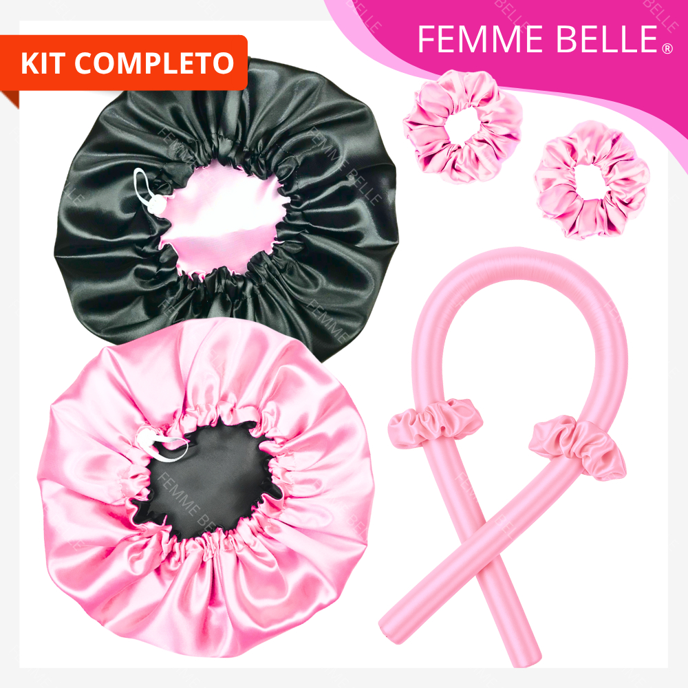kit cetim touca cetim dupla face ajustável + modelador curling rod + scrunchies