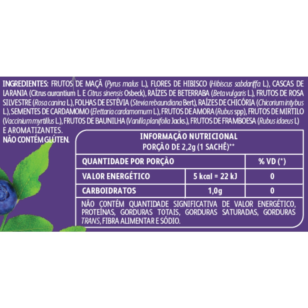 A linha de Frutas e Flores da Leão possui a combinação de aromas e sabores, pensados especialmente para quem gosta de ter uma experiência diferente na hora de beber seu chá! #FicadeBoa com Chás Leão ESPECIFICAÇÕES: - Sabores: Amora, Mirtilo e Baunilha - Maracujá, Laranja e Gengibre - Aplicação: Chá para Infusão. - Embalagem: Kit de 2 (Duas) caixas de chá com 10 (Dez) sachês embalados individualmente. Totalizando 20 Sachês. - Porção: 2g (1 sachês) - Fabricante: Leão Alimentos e Bebidas LTDA. - Origem: PR/Brasil. TABELA NUTRICIONAL: - Valor Energético: 5 kcal por porção de 2 gramas - Carboidratos: 1,1g por porção de 2 gramas INGREDIENTES: - Sabor Amora, Mirtilo e Baunilha: FRUTOS DE MAÇÃ (Pyrus malus L.), FLORES DE HIBISCO (Hibiscus sabdariffa L.), FRUTOS DE ROSA SILVESTRE (Rosa canina L.), CASCAS DE LARANJA DOCE (Citrus aurantium L.), RAÍZES DE BETERRABA (Beta vulgaris L.), FOLHAS DE ESTÉVIA (Stevia rebaudiana Bert), RAÍZES DE CHICÓRIA TOSTADA (Chicorium intybus L.), SEMENTES DE CARDAMOMO (Elettaria cardamomum L.), FRUTOS DE FRAMBOESA (Rubus idaeus L.), FRUTOS DE AMORA (Rubus spp), FRUTOS DE MIRTILO (Vaccinium myrtillus L.), FRUTOS DE BAUNILHA (Vanilla planifolia Jacks.) E AROMATIZANTE. - Sabor Maracujá, Laranja e Gengibre: FRUTOS DE MAÇÃ (Pyrus mailus L.), FLORES DE HIBISCO (Hibiscus sabdariffa L.), CASCAS E LARANJA DOCE (Citrus aurantium L.), RAÍZES DE CENOURA (Daucus carotaL.), RIZOMAS DE GENGIBRE (Zingiber officinale Roscoe), RAÍZES DE CHICÓRIA TOSTADA (Chicorium intybus L.), FOLHAS DE ESTÉVIA (Stevia rebaudiana Bert), POLPA DE MARACUJÁ-AZEDO (Passiflora edulis F. Flavicarpa Degener), FRUTOS DE BANANA-NANICA E AROMATIZANTE ALÉRGICO: - NÃO CONTÉM: Glúten MODO DE PREPARO: - Despeje água quente (a 90C) em uma xícara de 240ml. - Coloque o sachê e deixe em infusão por cinco (5) minutos. - Se preferir, adoce. INFORMAÇÕES IMPORTANTES: - Conservar ao abrigo do Sol e Calor em local limpo, seco, arejado e sem odor. - Consumir imediatamente após preparo. - Produto sujeito a variação de suas características, devido à presença de ingredientes naturais. - Utilize água filtrada. - As imagens dos produtos e/ou seus componentes são meramente ilustrativos, exceto quando indicado o contrário no próprio anúncio.